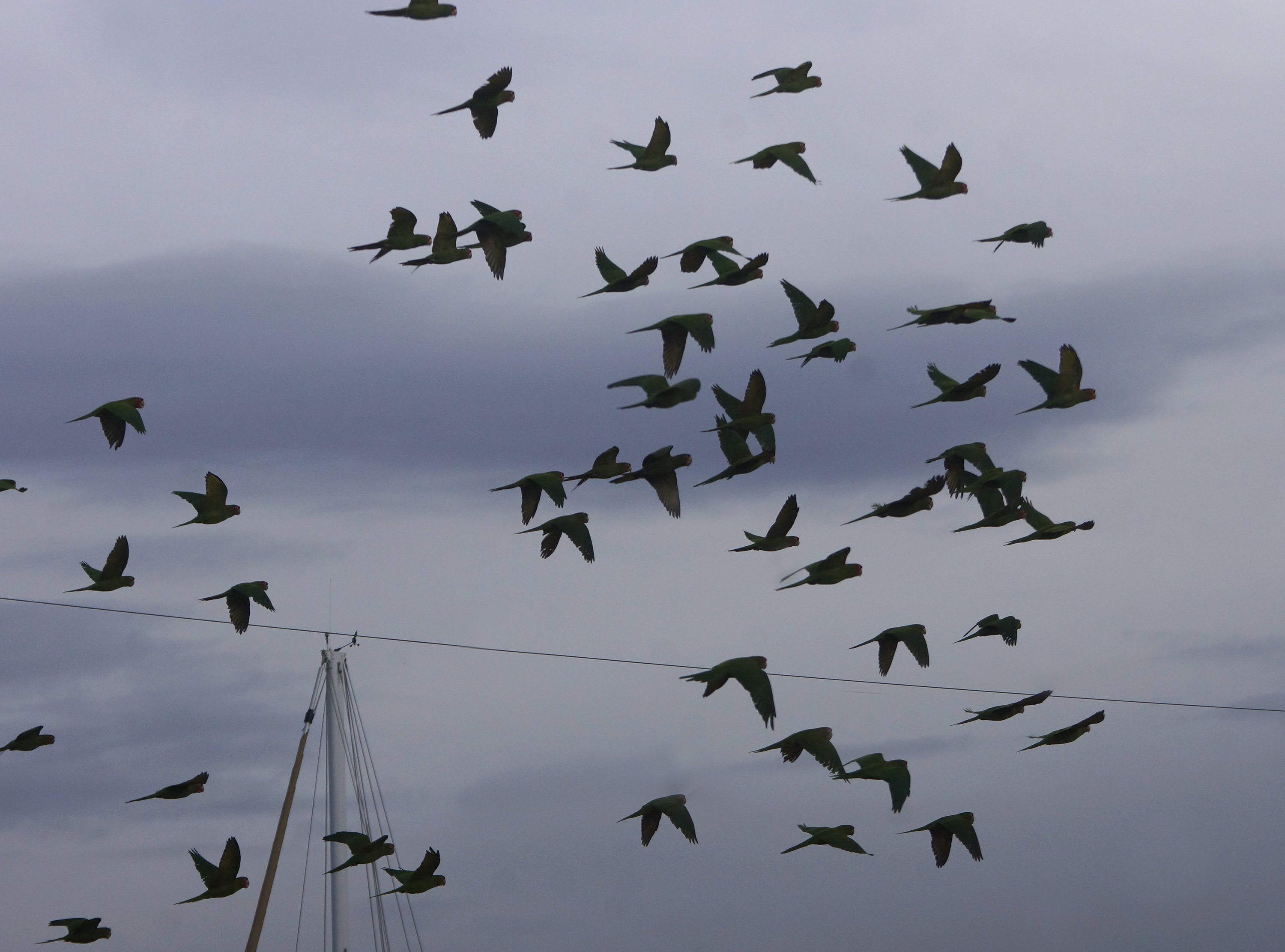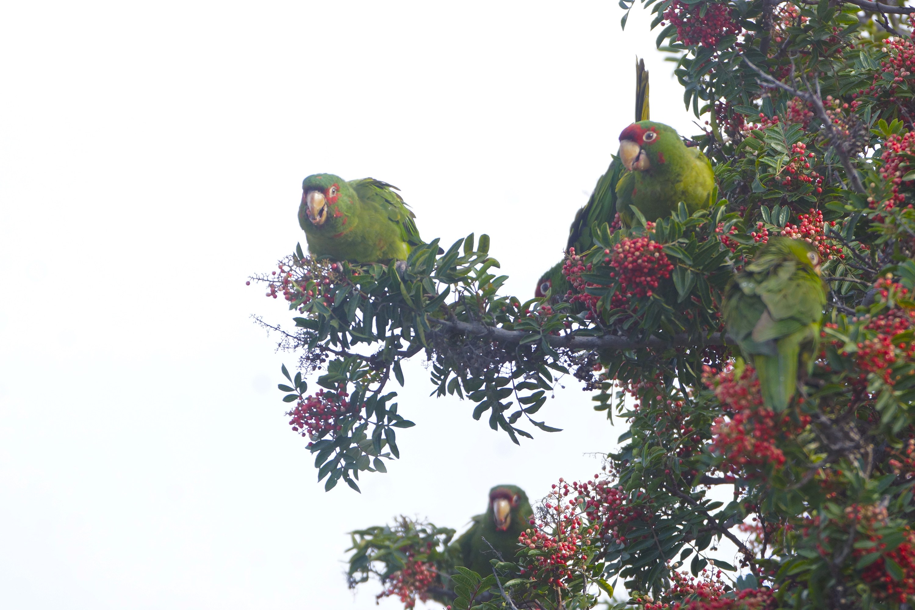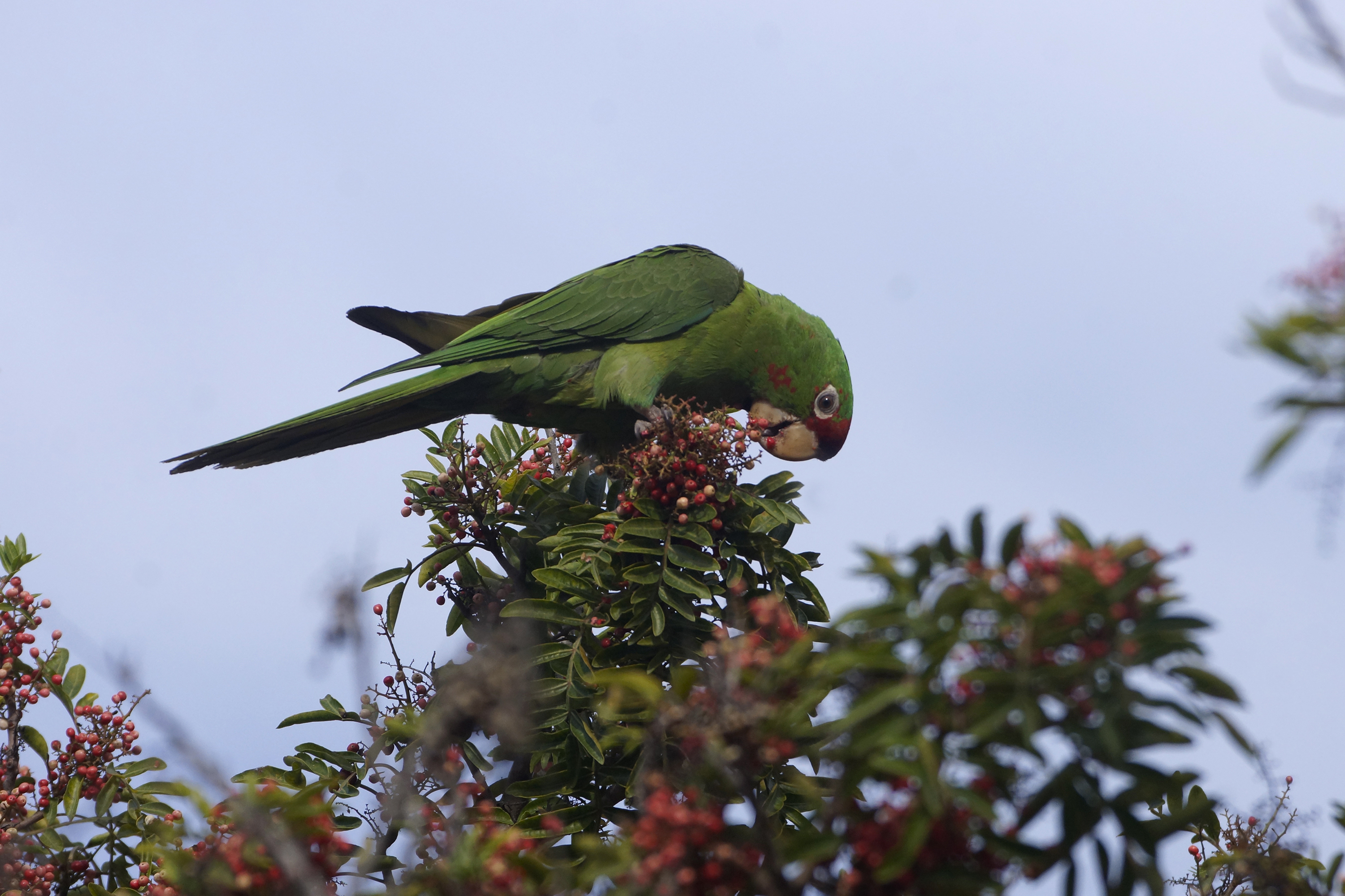 Australian green parrots in California eating white pepper in a California pepper tree! I had no idea these crazy characters ate pepper.