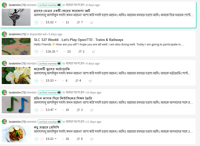 নাম: ইসরাত জাহান মিম। বর্তমানে অনার্স প্রথম বর্ষে পড়াশোনা করছেন। গ্রামের বাড়ি নোয়াখালীতে কিন্তু বাবার ব্যবসার কারণে বর্তমানে তিনি অবস্থান করছেন গাজীপুরে। স্টিমিট প্ল্যাটফর্মের "আমার বাংলা ব্লগ" পরিবারের একজন সদস্য হওয়ায় তিনি অনেক উৎসাহিত ও আনন্দিত। বই পড়তে তিনি পছন্দ করেন, সেই সাথে নতুন নতুন ফটোগ্রাফি করতে ও ইউনিক রেসিপি এবং নতুন নতুন ইউনিক ডাই তৈরি করতে বেশ পছন্দ করেন। তবে সবচেয়ে বেশি ভালো লাগে বিভিন্ন নতুন নতুন জায়গায় ঘুরে বেড়াতে ও প্রকৃতির কাছাকাছি থেকে প্রকৃতির অপরূপ সৌন্দর্য অবলোকন করতে। তিনি স্টিমিট প্ল্যাটফর্মে যাত্রা শুরু করেন ২০২০ সালের ১৭ই ডিসেম্বর।