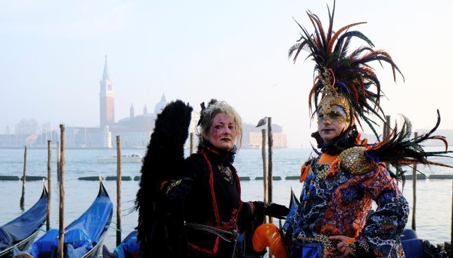 Hundreds of revellers wearing fancy masks and extravagant costumes lined the narrow alleys and bridges of Venice as carnival cheer exploded in the canal city.
