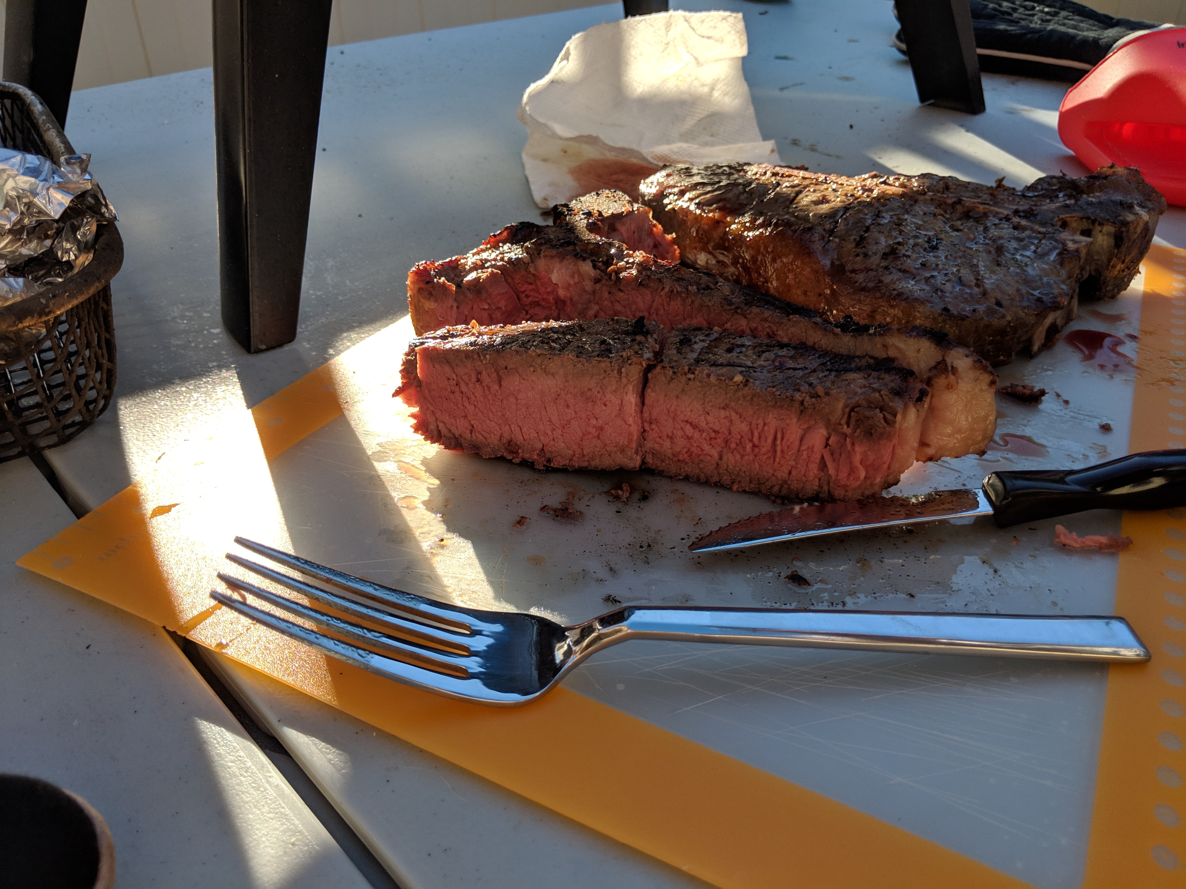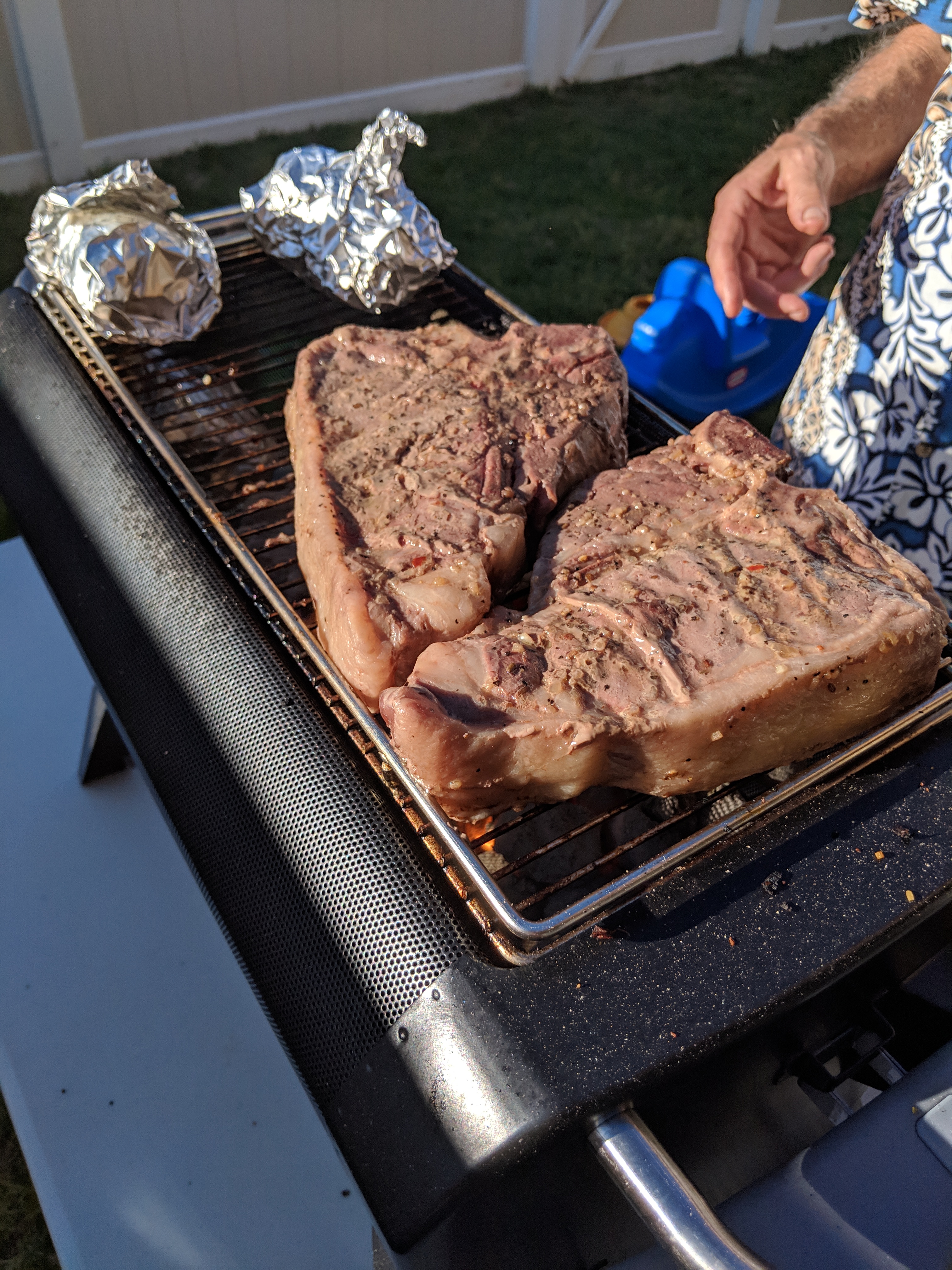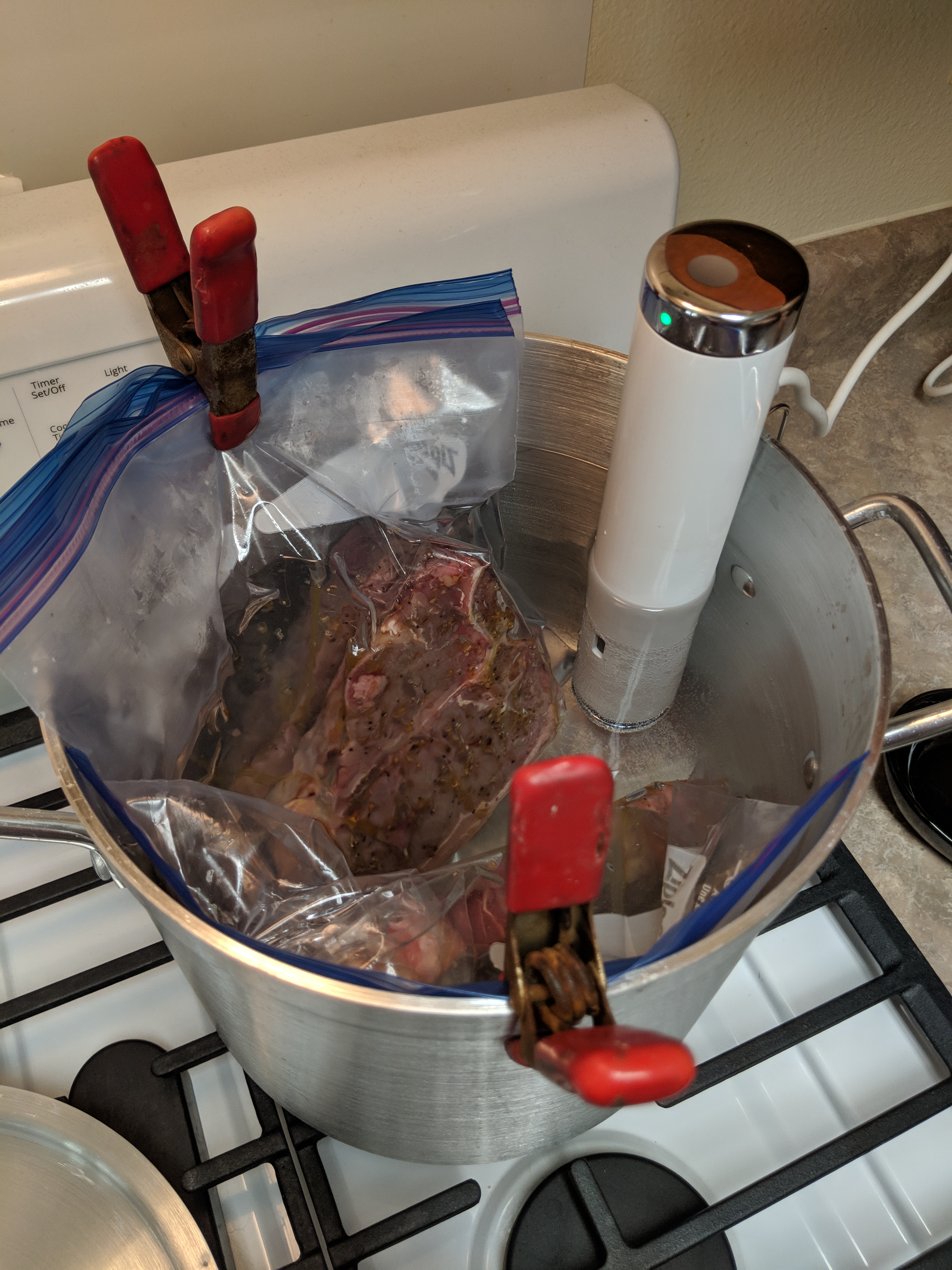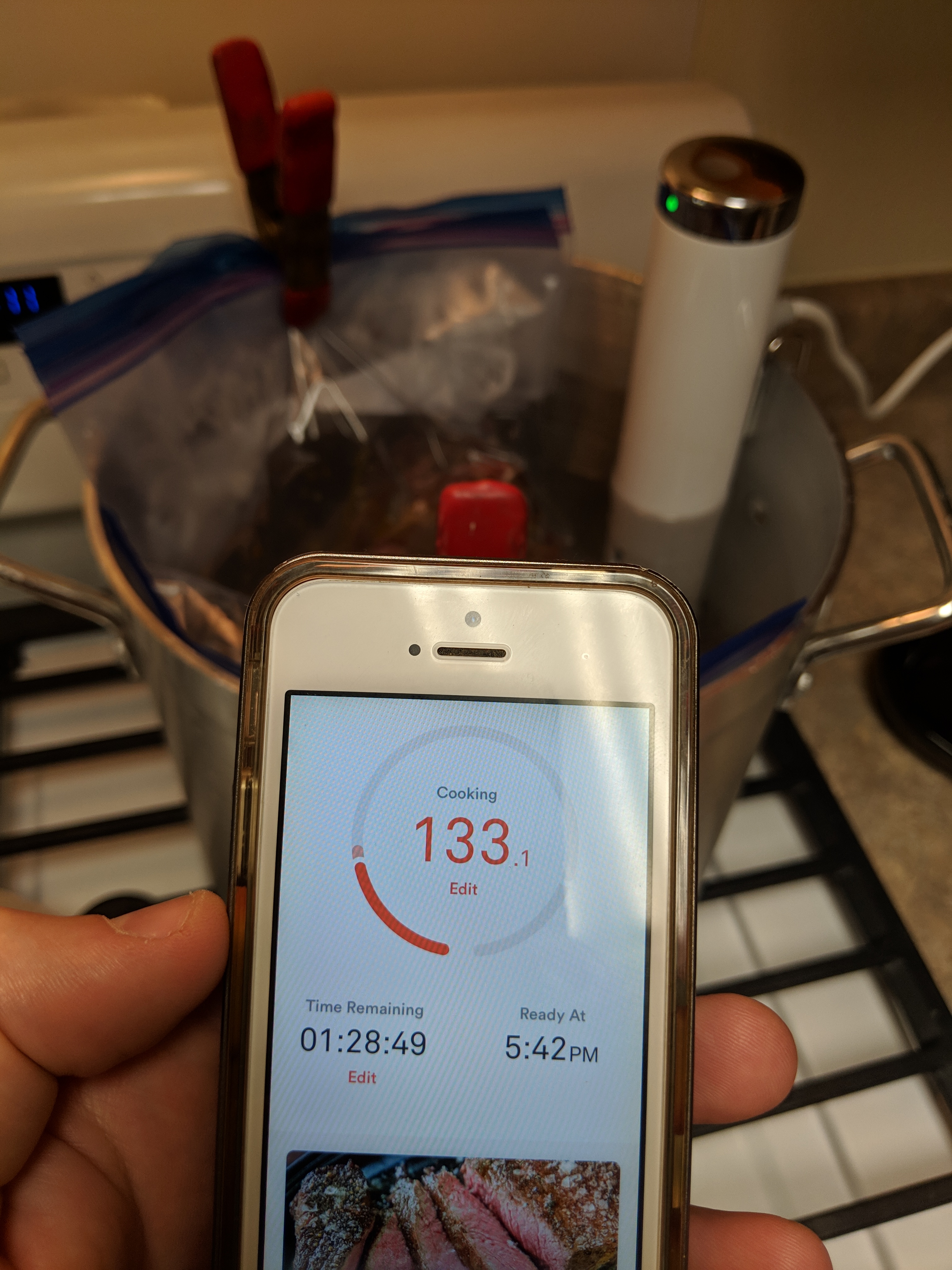 My brother has a really nice Sous-vide cooker, this one hooks up to your phone and you can control it via Bluetooth. We put some porterhouse steaks in plastic bags and kept the water at 133 degrees. For those who do not know how a Sous-vide works, the device keeps the water at an even temp so it cooks your food, in a plastic bag, to the exact desired temp. Depending on the size it takes a while but you don't need to guess when to stop cooking it or in my case burn it too much on the grill. So for a steak, if you want it 133, you set the water at 133 and cook for a little over an hour and thirty minutes.
