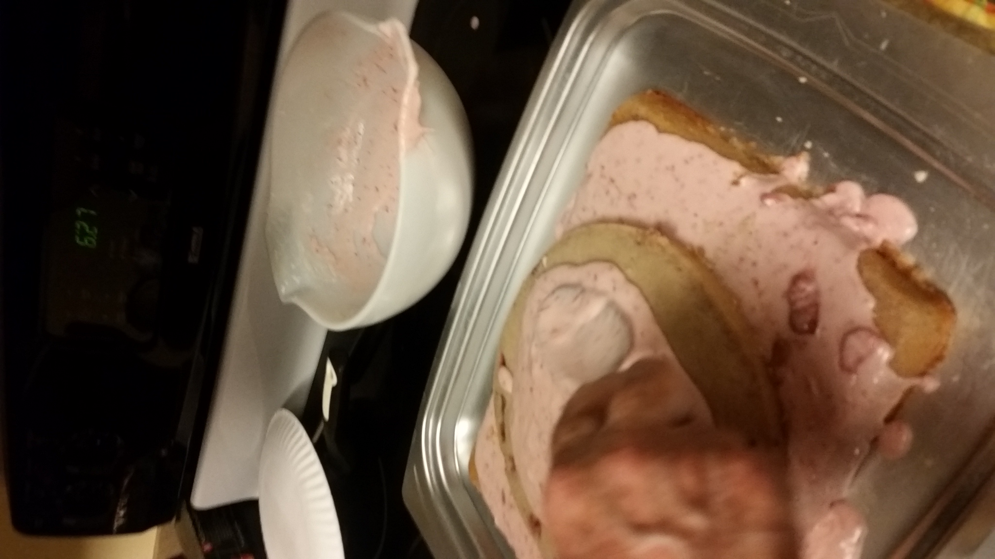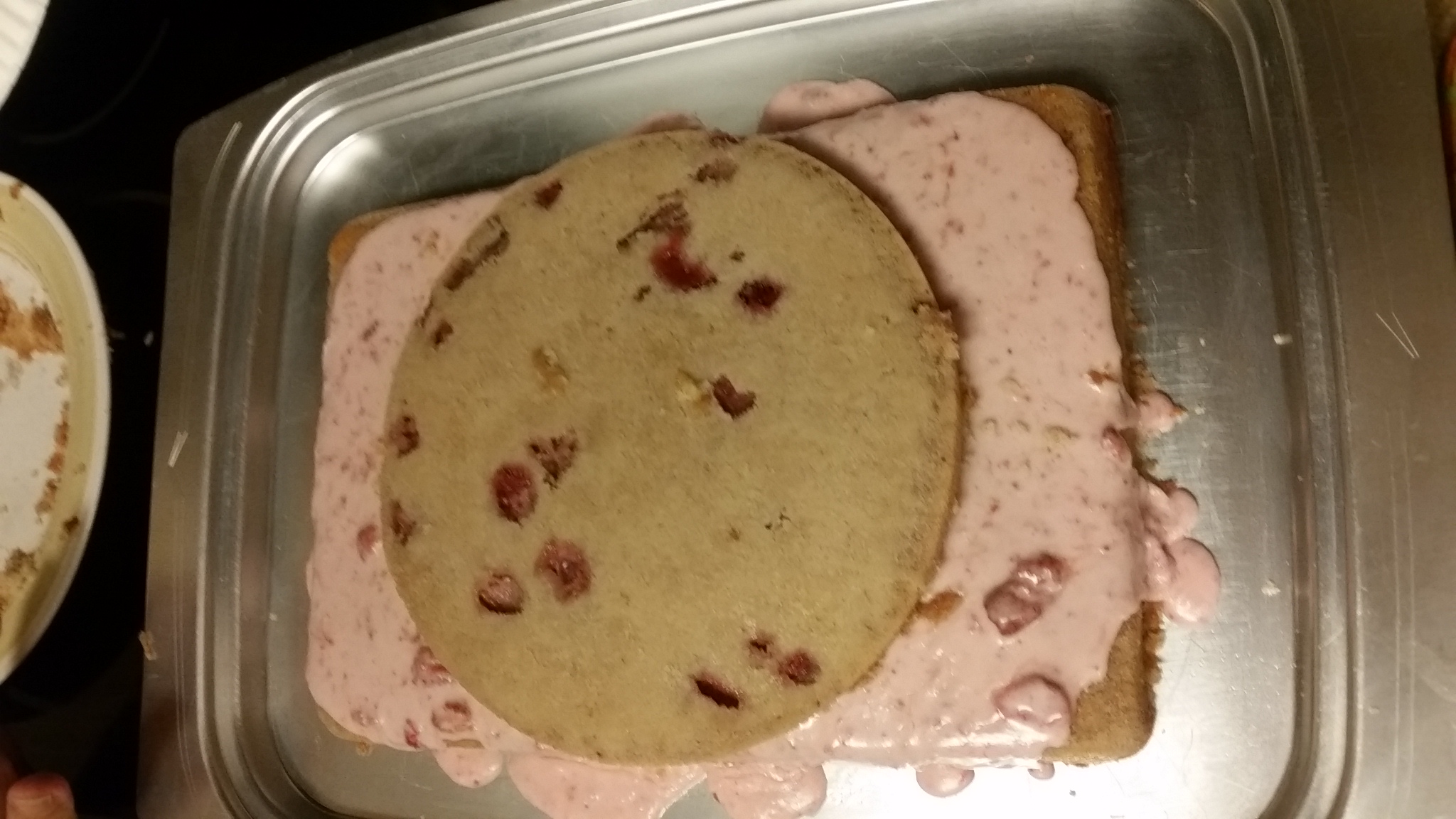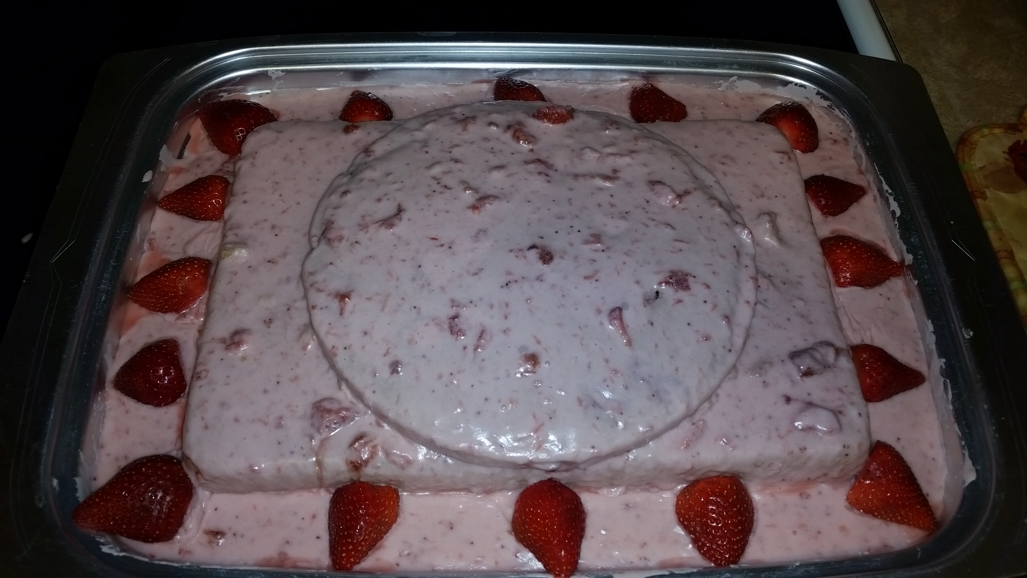 It came out a little thinner than her normal strawberry cake so we improvised again and made it a 2 layer, she spread the home made strawberry icing, then decorated the outside with sliced strawberries.