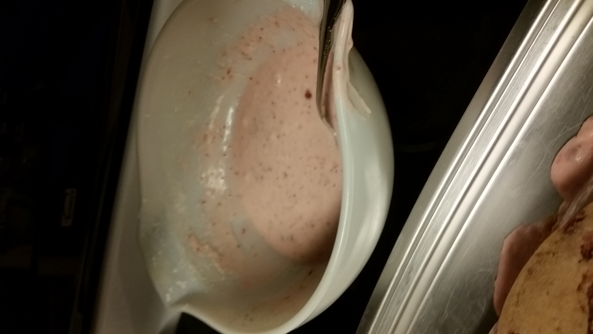 Since I had other stuff to do including making my famous mac-n-cheese, my mom agreed to bake the birthday cake for my son's birthday tomorrow. She would normally make this cake with the store bought cake mix but I really wanted it to be as all natural as possible so she improvised and used another family cake recipe for caramel cake that is all from sratch, but used strawberries instead of caramel.