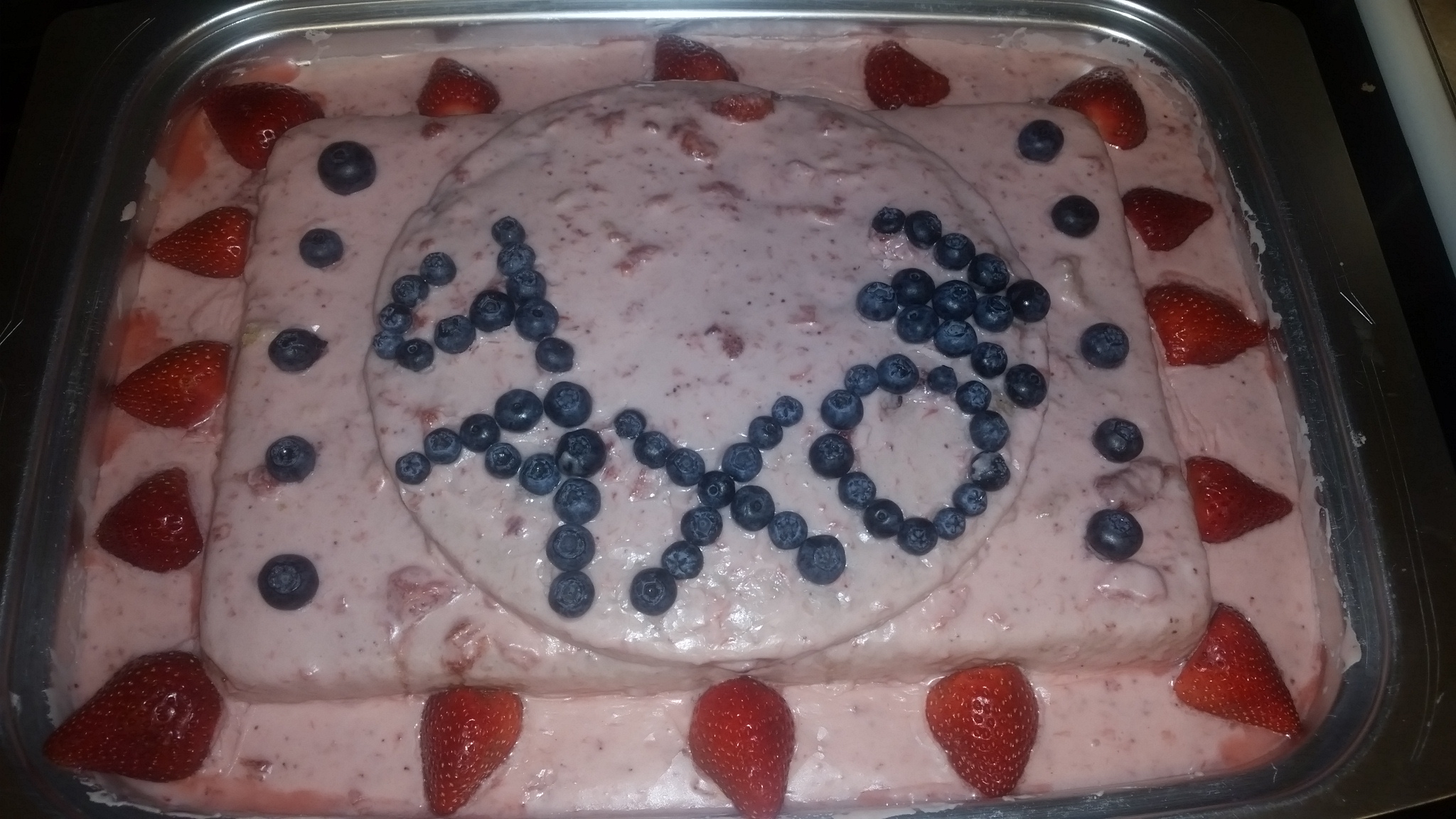 I wanted to decorate the cake with his name, but again did not want to use any artificial flavors or colors, so since my son loves blueberries as much as strawberries, I used some small blueberries to spell out his name on the top layer, then used a cake topper sign that says happy birthday. Tomorrow we will put the number 2 candle above the birthday sign. :-)