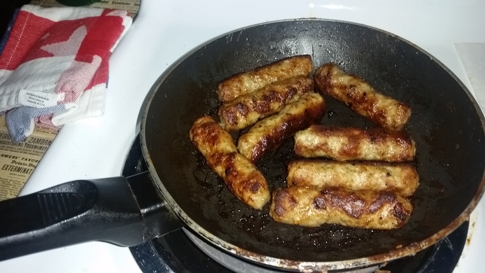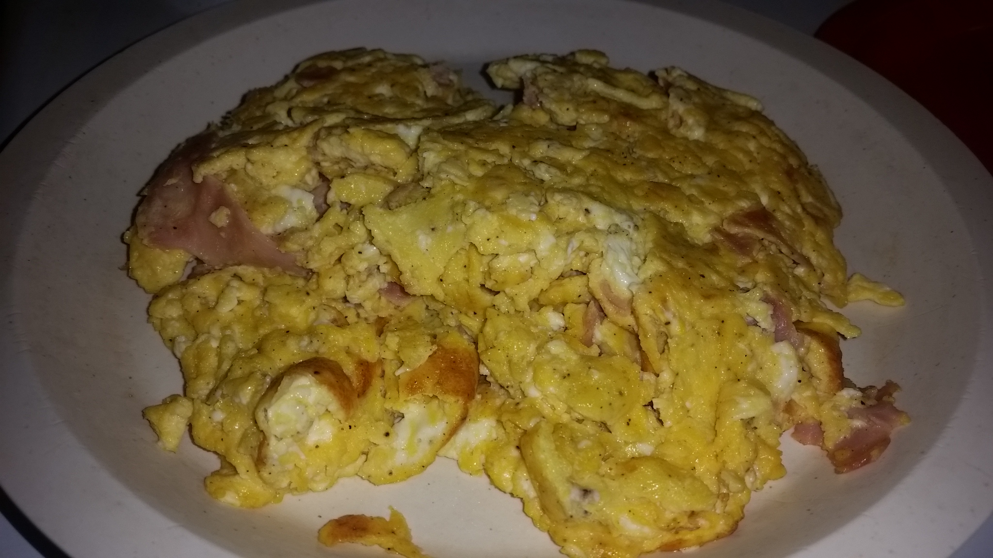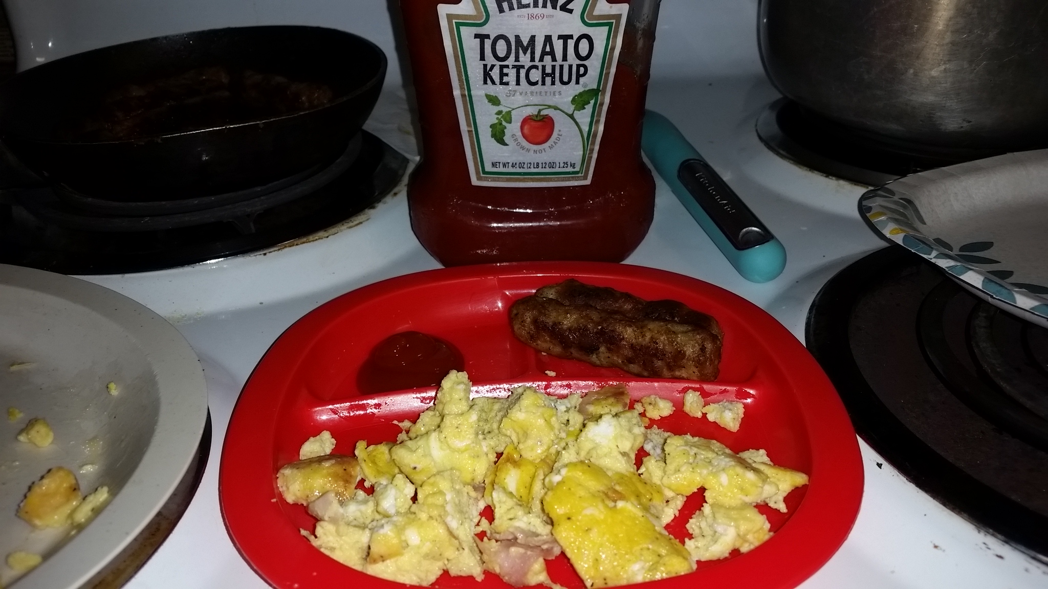 INGREDIENTS: EGGS, AMERICAN AND COLBY JACK CHEESES, SALT, PEPPER, GARLIC, AND NATURAL PORK SAUSAGE LINKS, KETCHUP FOR DIPPING. MY 2 1/2 YEAR OLD HELPED AND WE SHARED SOME WITH THE DOG. :)