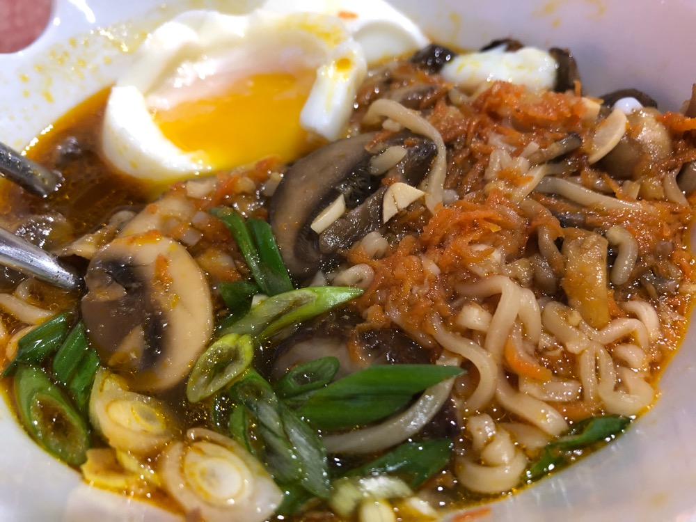 This is a super easy and cheap meal to make. Grated ginger and carrots. Some garlic and sesame oil really help build the broth’s overall flavor profile. Slice up some mushrooms and chives for garnish and you’re almost there.