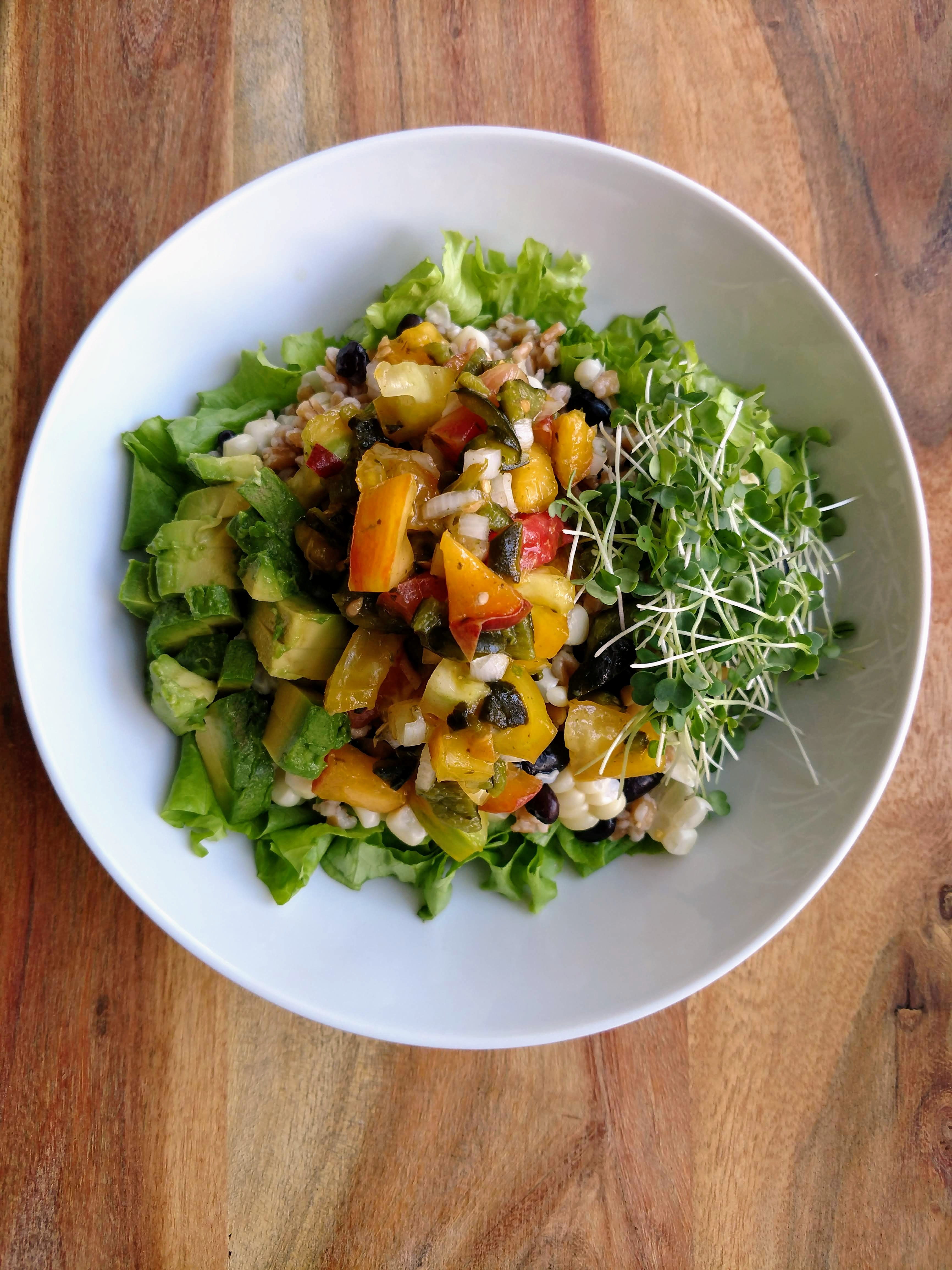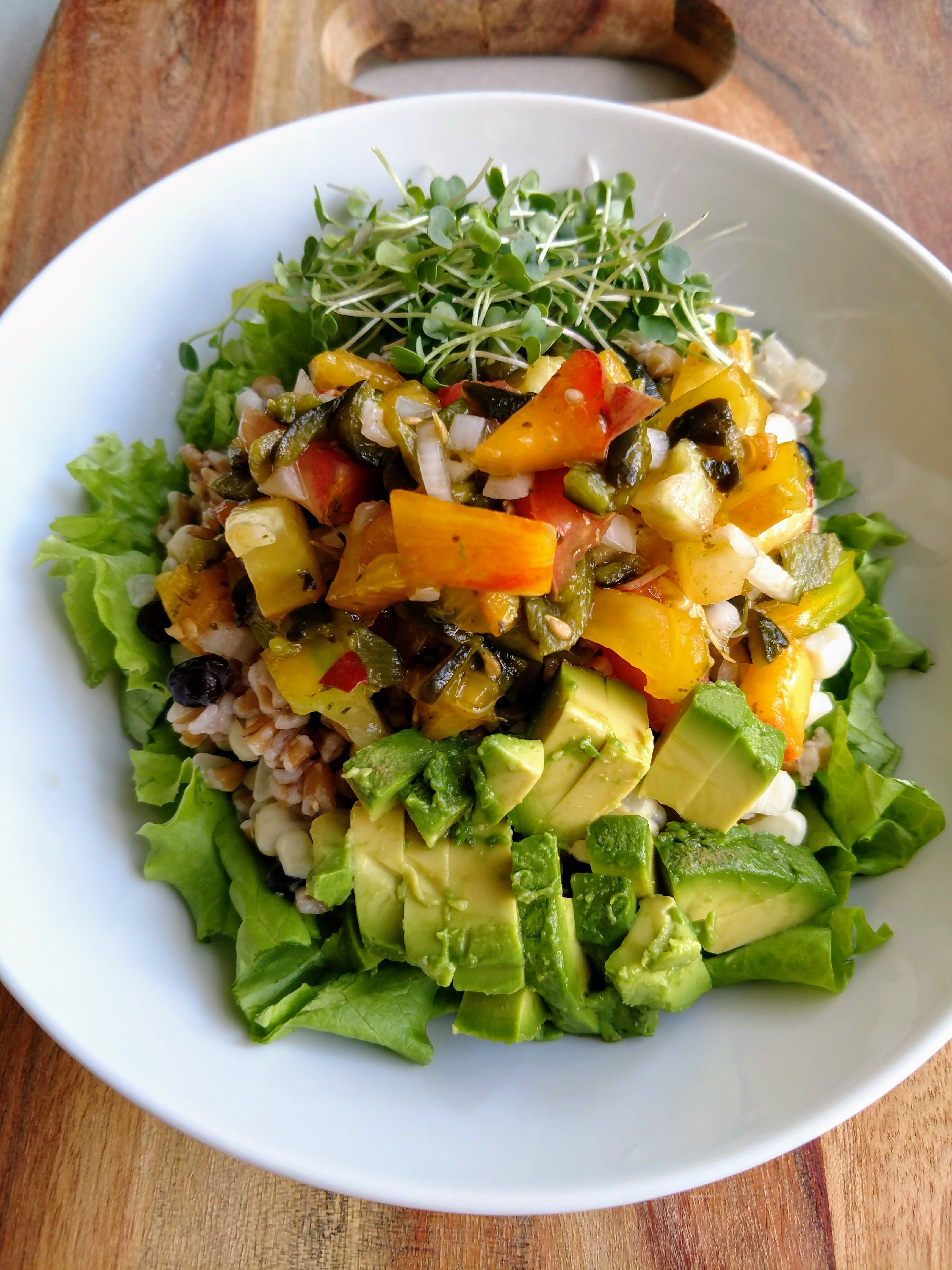 Bowl number two coming atcha with not only farmers market goodness, but also some of our peach-picking haul. @dksart is never one to turn down any kind of salsa, so I whipped up homemade peach salsa with roasted poblano peppers, heirloom tomatoes, onion and lime juice. That topped off a satisfying mixture of local sweet corn from some of my favorite farmers, black beans, and my favorite ancient grain--farro. Some more greens, sprouts, and creamy avocado made this dish a fresh summer delight!