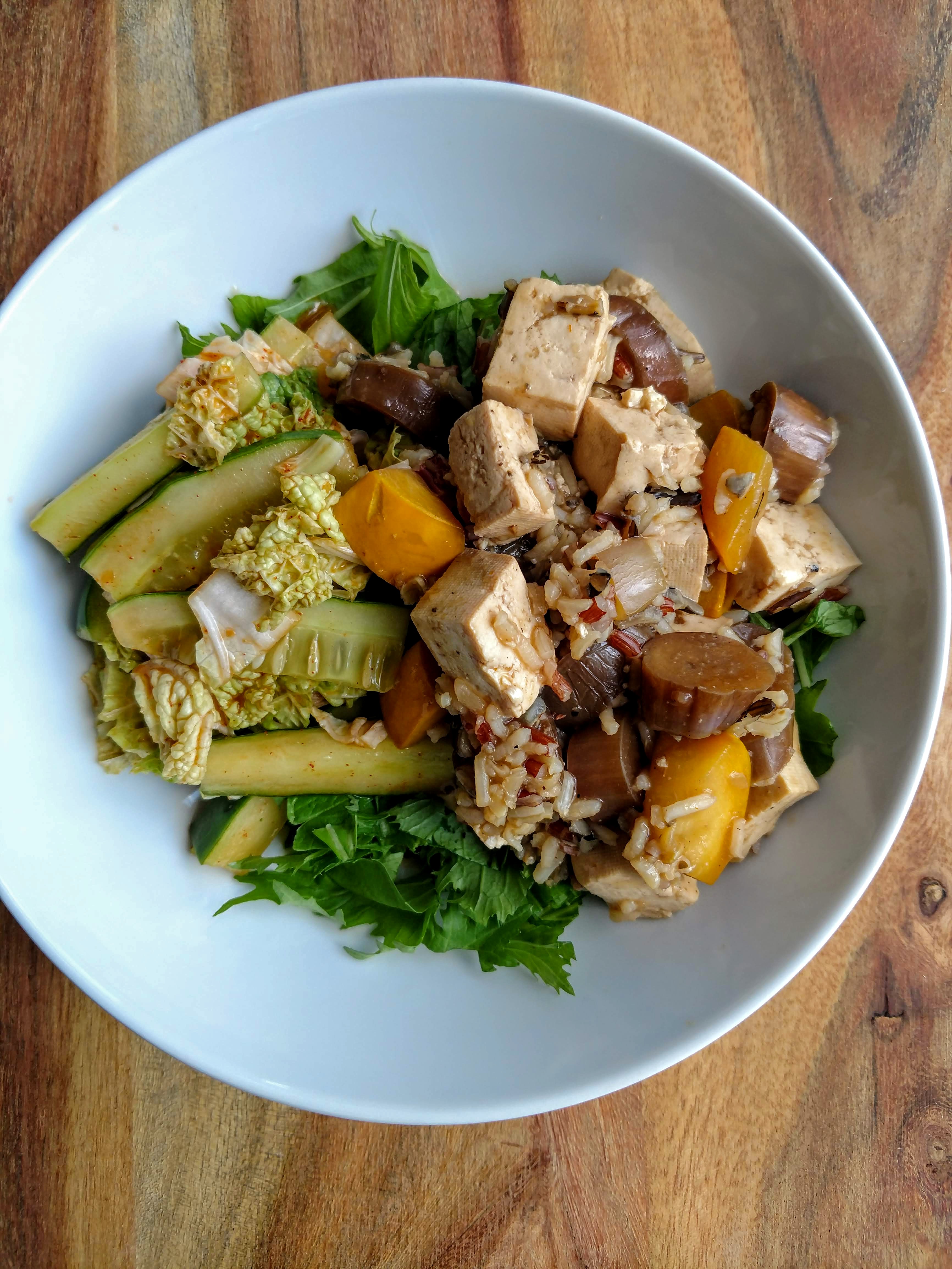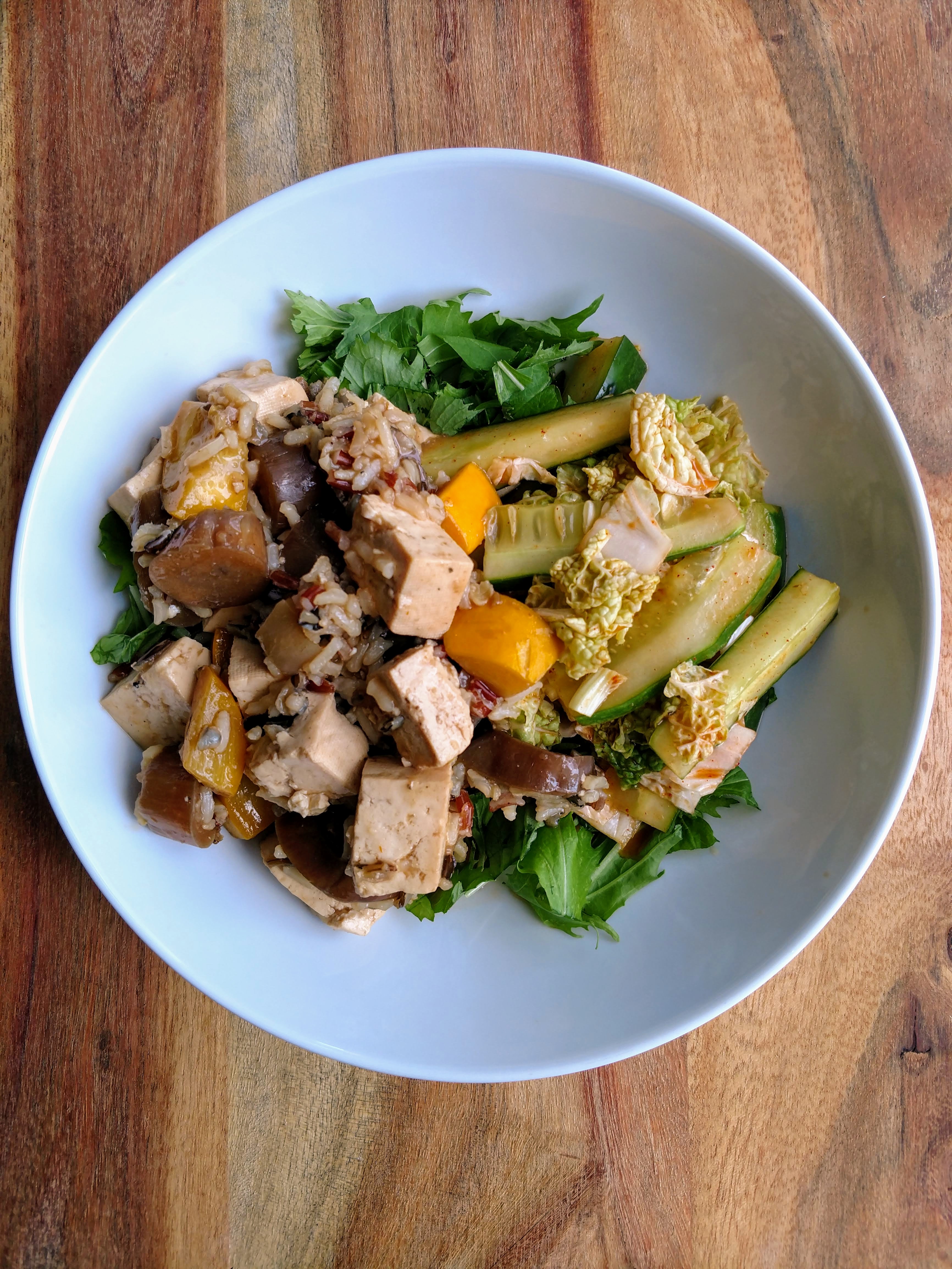 I used a sauce from one of my cookbooks (Vegan Richa's Everyday Kitchen) to add rocking flavor to some of my farmers market goodies with firm tofu. Eggplant, onions and yellow zucchini from the market cooked up on the stove top and finished off with a wild rice mixture. As we have also had a solid crop of cucumbers from our own garden, I also did a little spicy salad slightly reminiscent of kimchi with cukes and Napa cabbage. I believe the greens forming the bed of this yummy bowl were mizuno, from my favorite hydroponic dudes.