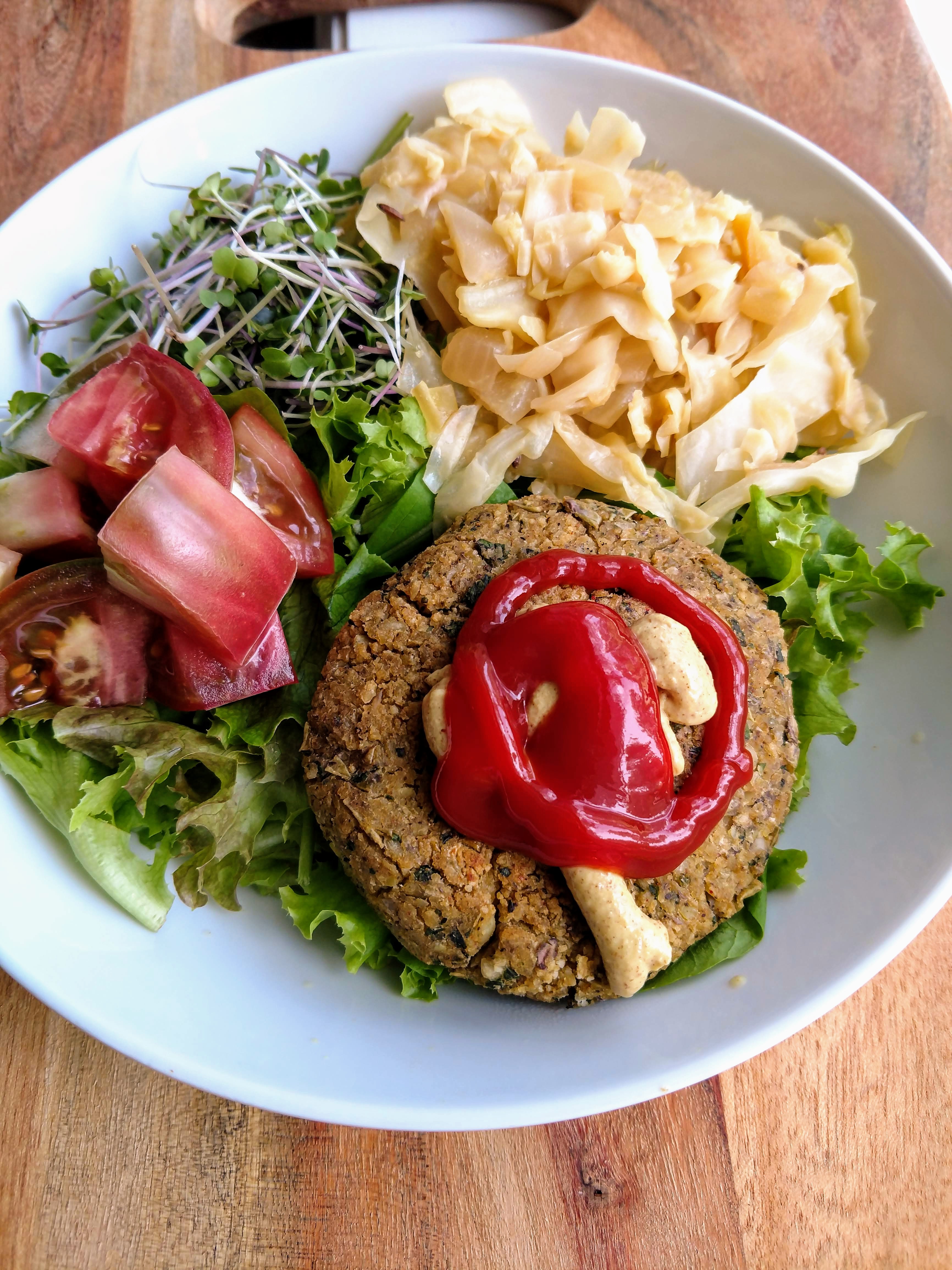 I'll round out my entry with one of my favorite veggie burgers that I created in my own kitchen last summer. The pinkeye peas are popping up again at the market, so I threw together my veggie burger recipe using those seasonal gems. I was also inspired to use up a head of cabbage by a post from @abitcoinskeptic, so I cooked mine up with an onion, apple, apple cider vinegar, Dijon mustard and caraway seeds. Yep, more greens, nutritious sprouts and mouthwateringly (is that a word?) delicious heirloom tomatoes. I also had more of that awesome fresh corn to serve up on the side because it's only available for so long. This time around I give @dksart an assist as my favorite sous chef as he grilled the burgers and corn.