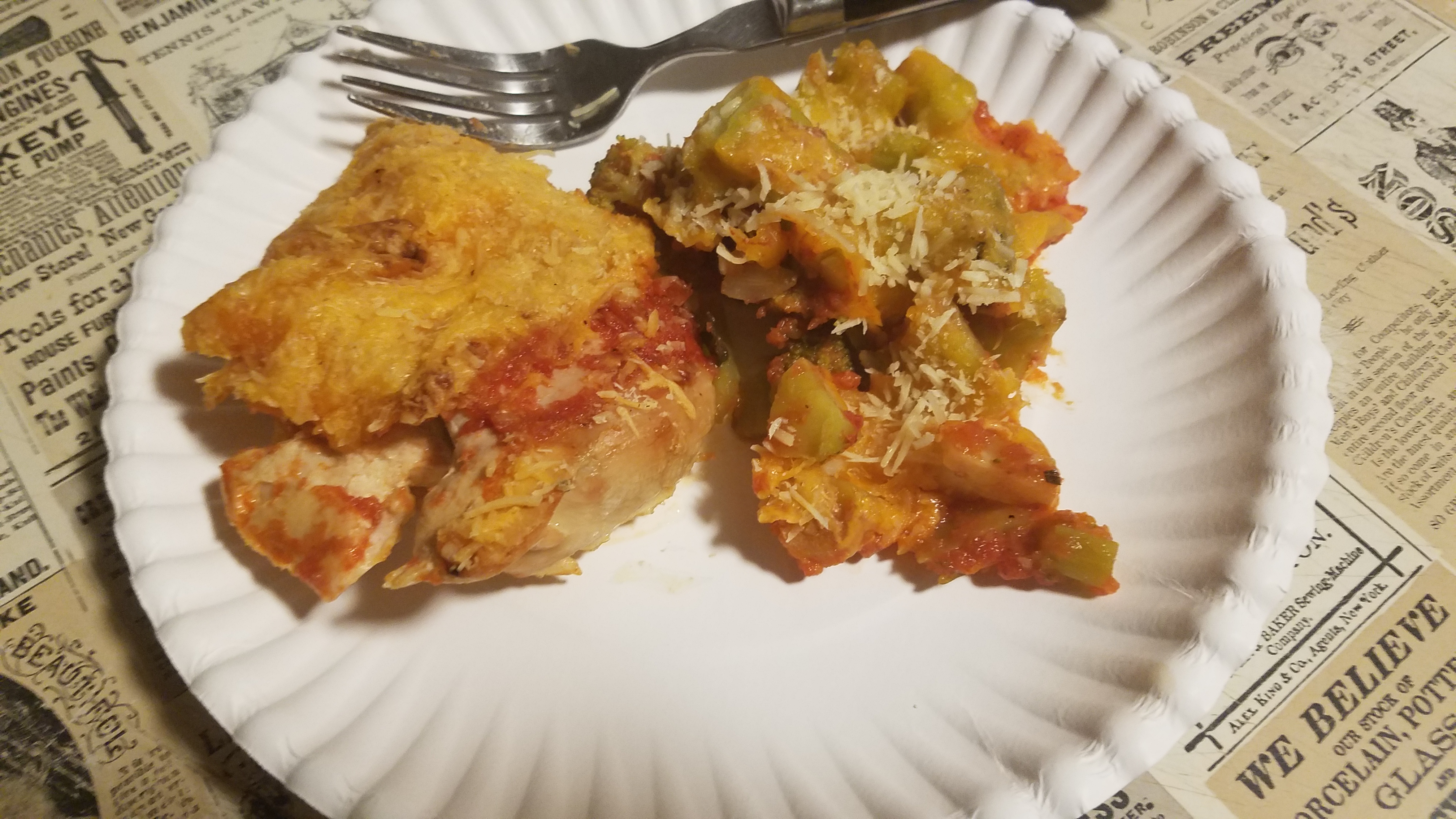 Love Chicken Parm. Looks like a great dish and the paper plates make it even better.