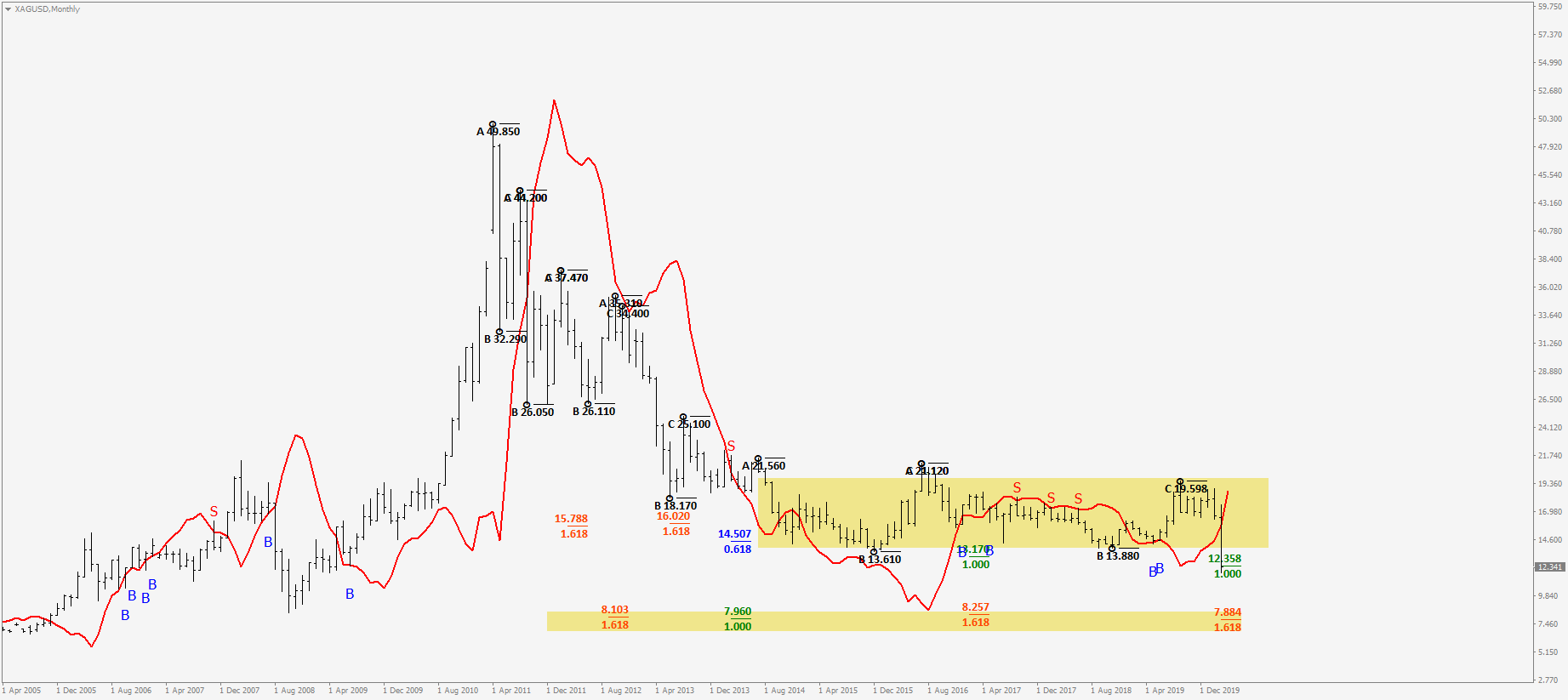 As DiNapoli traders we are always able to determine market turning points ahead of time with the help of our advanced Fibonacci analysis. Below is the monthly silver chart. Look at the cluster of Fibonacci extensions around '8'. We should expect a massive reaction if the market drops to that level. Keep a copy of this chart as this will be a lifetime opportunity for those who want to long silver.