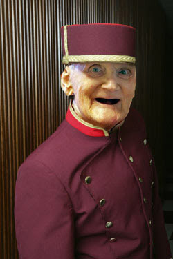 Sitting in the lobby of the hotel, an obvious foreign character, dressed in a Bellhop uniform, jumps up from a chair, flashes a smile.