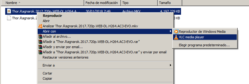 buscamos la carpeta y abrimos la pelicula con el reproductor vlc