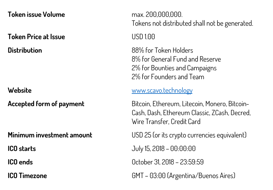 88% - SCAVO tokens can be purchased during pre-sale to ICO (PreICO) and during the ICO sale using the crowdsale mechanism, which will take up to 108 days.