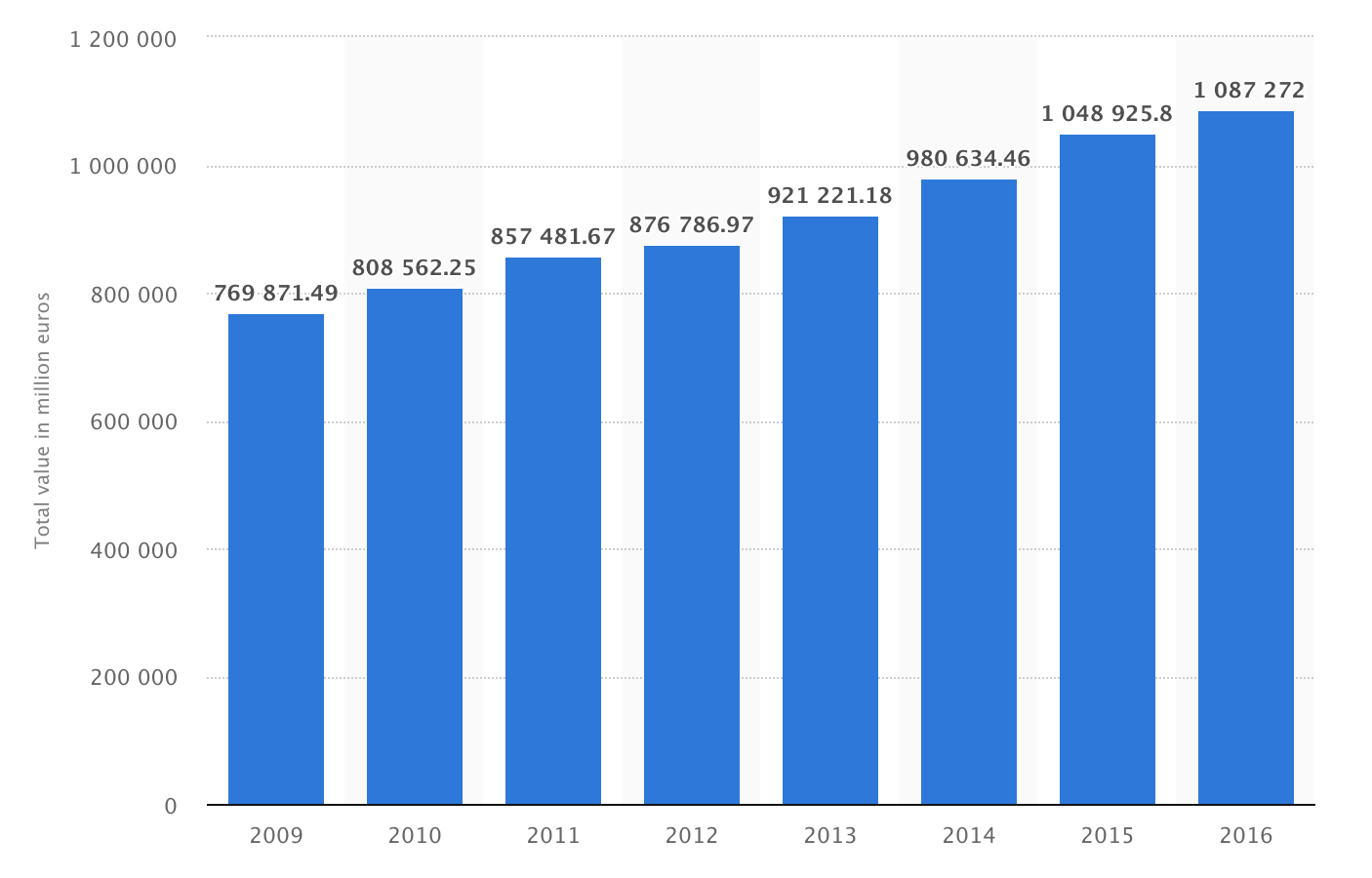 Total value of currency in circulation in the Euro area from 2009 to 2016 (in million euros)