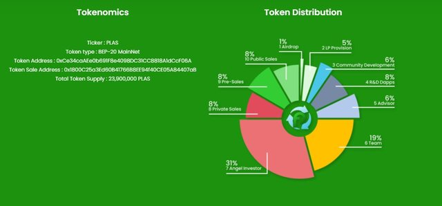 PLAS is the Plastic Finance ecosystem's native coin. PLAS was developed to support recycling initiatives and serve as a governance and ownership token to receive periodic dividends or profit-sharing from recycling and DeFi transactions and internal exchange margins. Plastic Finance will charge a 5% fee on the internal exchanger spread price of plastic regrinds and a 0.175 percent fee on saving withdrawal or loan payment transactions in the DeFi platform. All of these fees will be collected in a wallet and regularly dispersed via a smart contract. Plastic Finance receives 60% of the net profit from the cooperative recycling company each year. In turn, Plastic Finance will pay the fees and profit-sharing to PLAS investors as dividends.