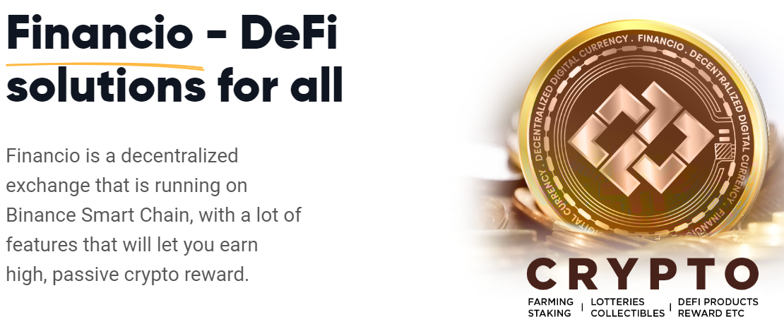 The Financio project is a decentralized exchange that runs on the Binance Smart Chain, and has many decentralized finance features that make it possible to generate additional passive income from Staking, Farming and providing liquidity.