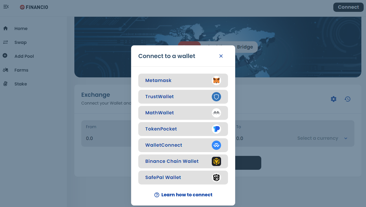 The Financio platform is very easy to use. To do this, you do not need to register on the platform, but you just need to connect your wallet via the Web3 protocol.