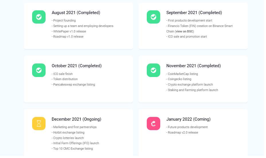 The Financio project, like other cryptocurrency projects, is moving according to the roadmap. If we compare the already past stages of development of the Financio project with its roadmap, then we can see that this project clearly adheres to its plans and implements them on schedule. The next milestone, which is set for January 2022, is the development of new additional products and the emergence of Roadmap 2.0, which will tell us about these new products and their timing.