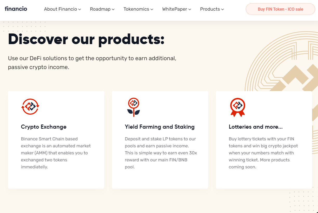 Financio - это платформа, которая использует децентрализованный финансовый протокол, который будет учитывать различные финансовые потребности пользователей. Используя платформу, который создал проект Financio, пользователи могут получить доступ к различным функциям DeFi, таким как обмен криптовалютой, фарминг, стэйкинг, лотереи и операции.