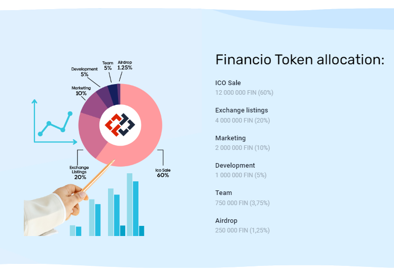 12 миллионов токенов FIN выделено на продажу, в рамках проведения ICO. Начальная цена токена FIN, составляет 0.04 доллара. Общее количество токенов FIN, составляет 20 миллионов. Распределение токенов указано на рисунке ниже.