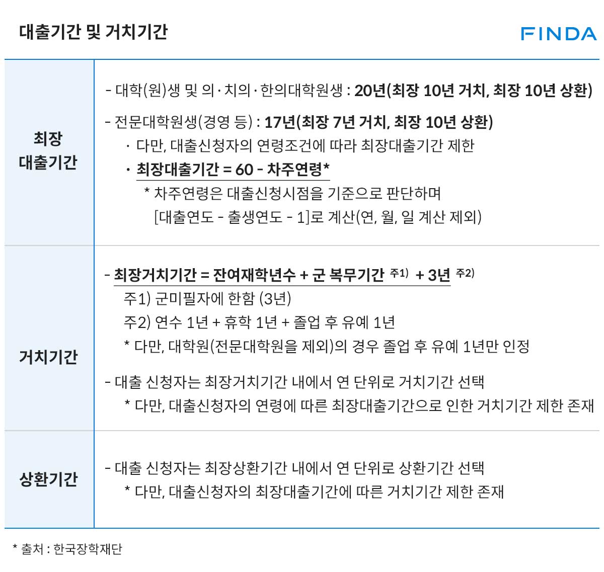 일반 상환 학자금 대출의 거치 기간과 상환 기간이 궁금하다면, 아래 표를 참고하자. 거치 기간은 대출 원금에 대한 이자만 납부하는 기간이고 상환 기간은 원리금을 균등 분할 상환하는 기간이다.
