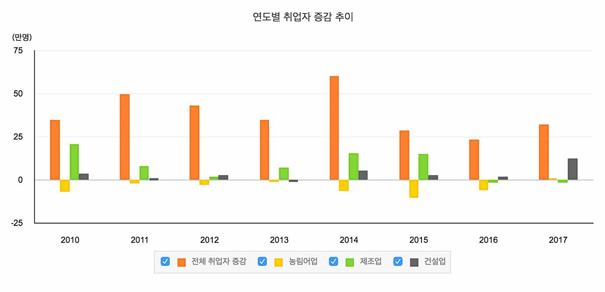 위 표는 우리나라 연도별 취업자 증감을 확인할 수 있는 통계청의 ‘e-나라지표’로, 2015년부터 증가폭이 낮아지긴 했지만, 20만 명은 넘었다. 하지만, 2018년 2월부터 20만 명 이하로 떨어졌으며, 5월에는 10만 명도 넘지 못했다.