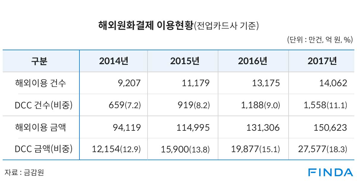 금융감독원의 자료를 참고하면, 지난해 전체 해외 결제액 15조623억원 중 18.3%인 2조7577억원이 원화로 결제됐다. 해외이용 금액이 늘고, 해외원화결제 이용비중도 함께 높아짐에 따라 2014년의 두 배가 넘는 수치이다. 수수료율을 3%로 계산한다면 연간 약 827억원의 수수료가 불필요하게 부과된 셈이다.