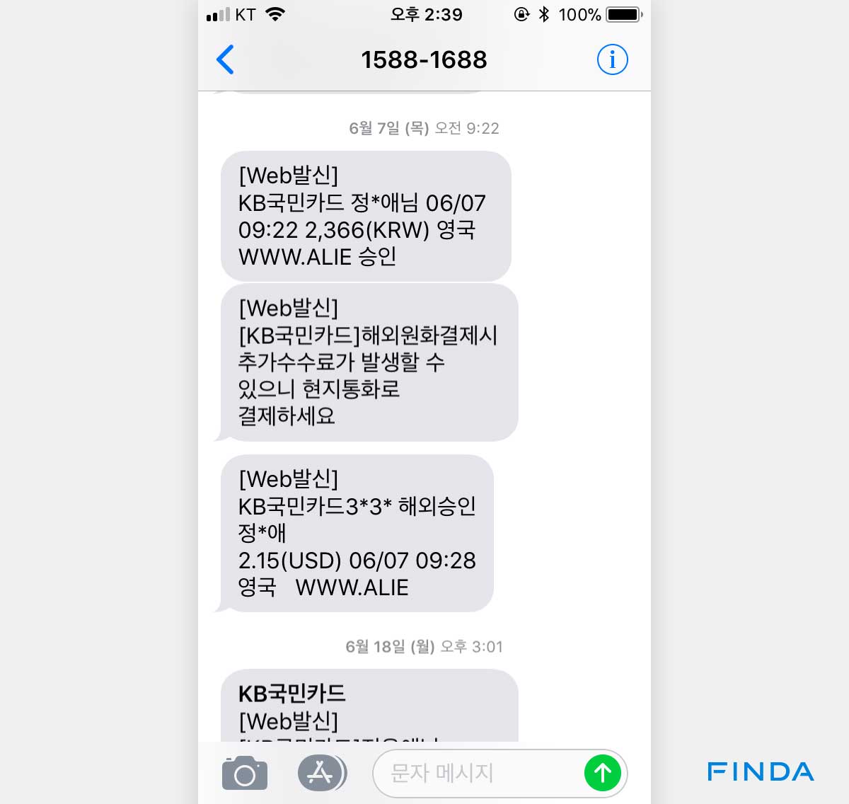 <해외원화결제 수수료에대한 안내문자, 출처:핀다>