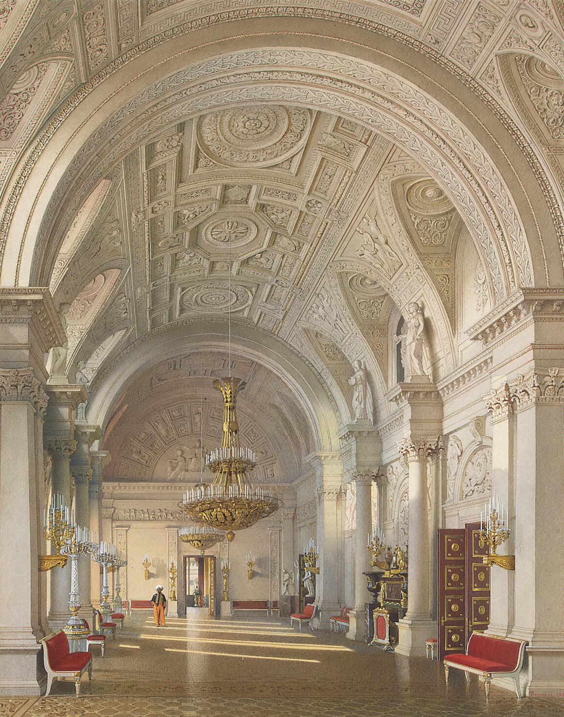'' Interiors of the Winter Palace. The White Hall '', Drawing , Watercolour and white , Image Source