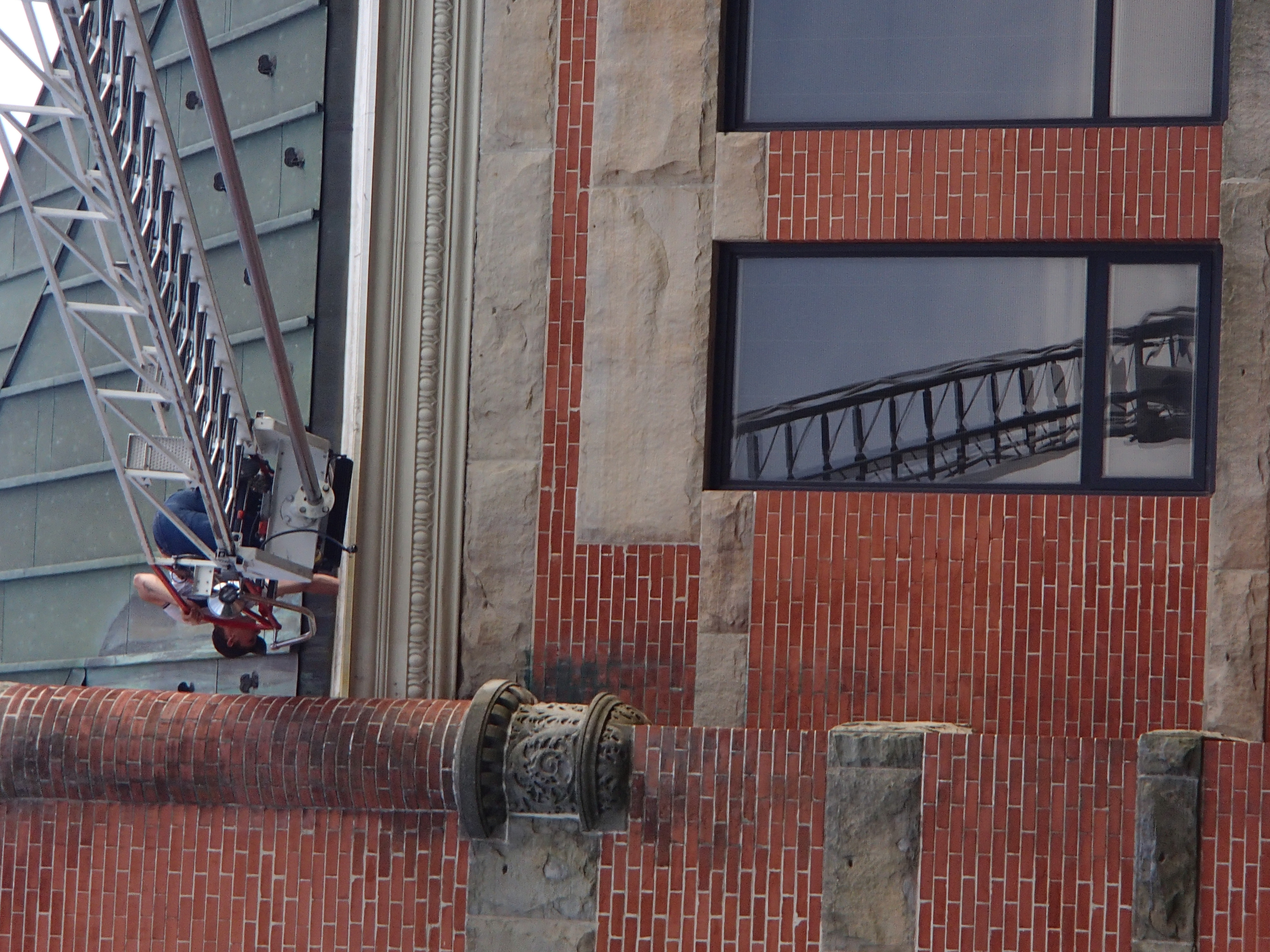 The aerial ladder is 105 feet, which means we can reach the main floors of the courthouse, and a stream of water from the tip of the ladder could easily reach the clock tower. Here's hoping that never becomes necessary. Fire department ladder trucks are often called on to help with such things as hanging town decorations and, oh, keeping the recently renovated courthouse from getting water damage.
