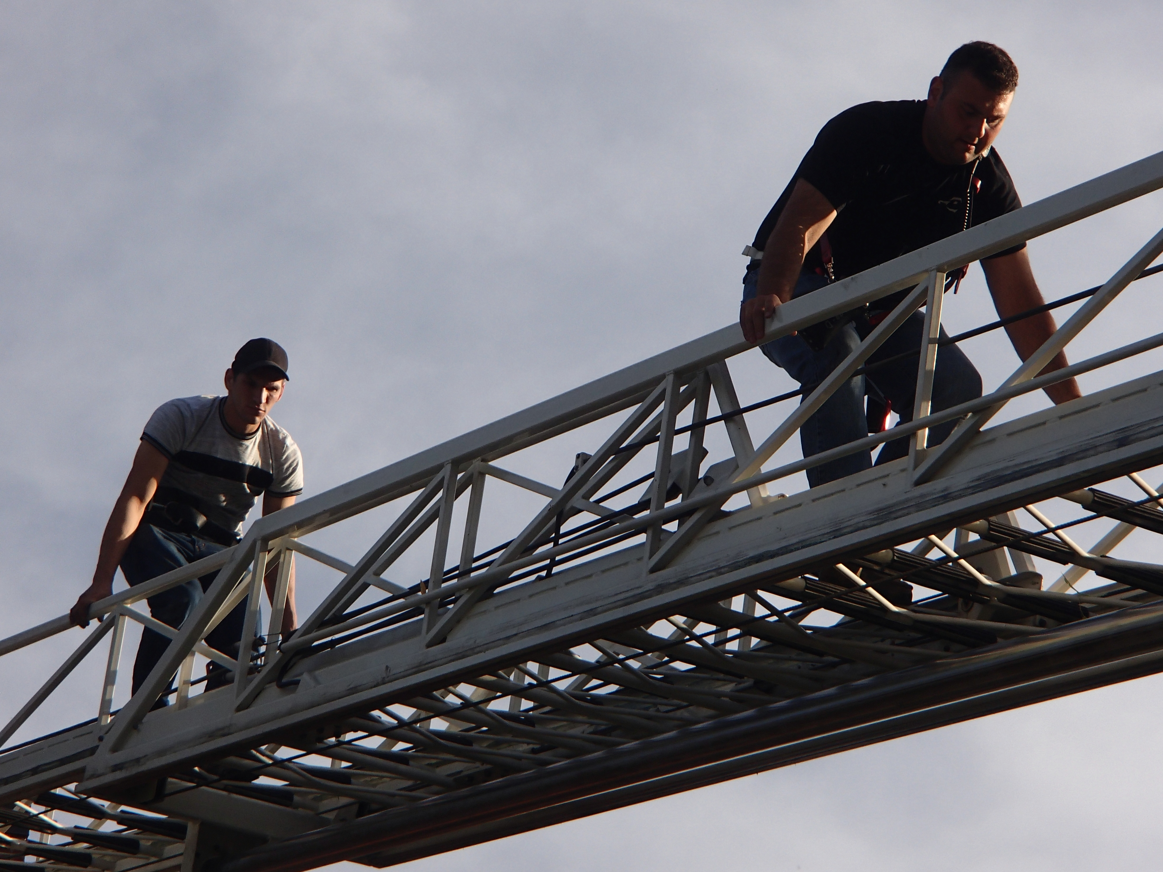 I stopped being an active firefighter just before Ladder 99 came along, so I've only climbed up and down an aerial a few times. There's no easy way to do it. But when it's position isn't too steep, it's a little like climbing downhill on a steep bridge. Do they make steep bridges? I hope not.
