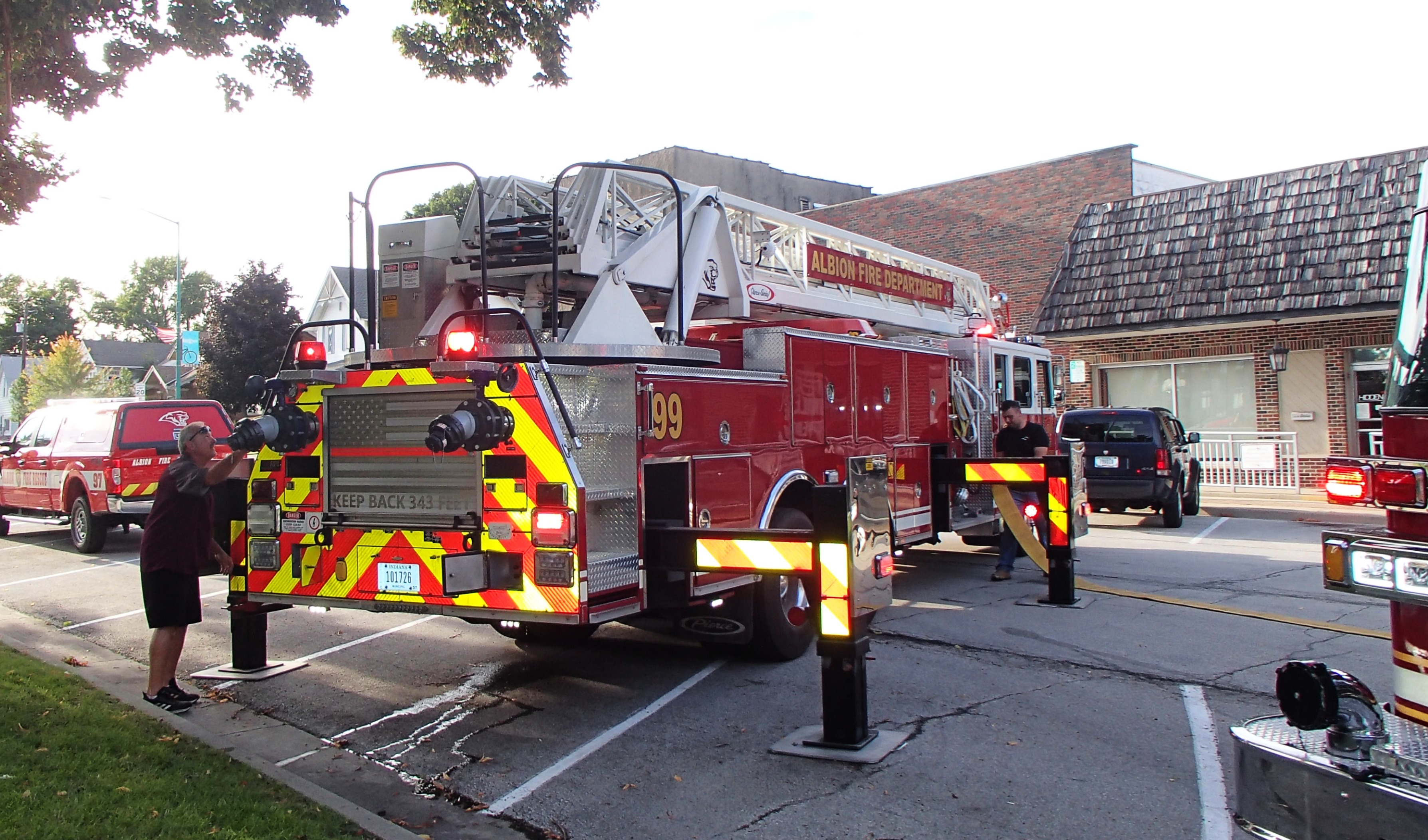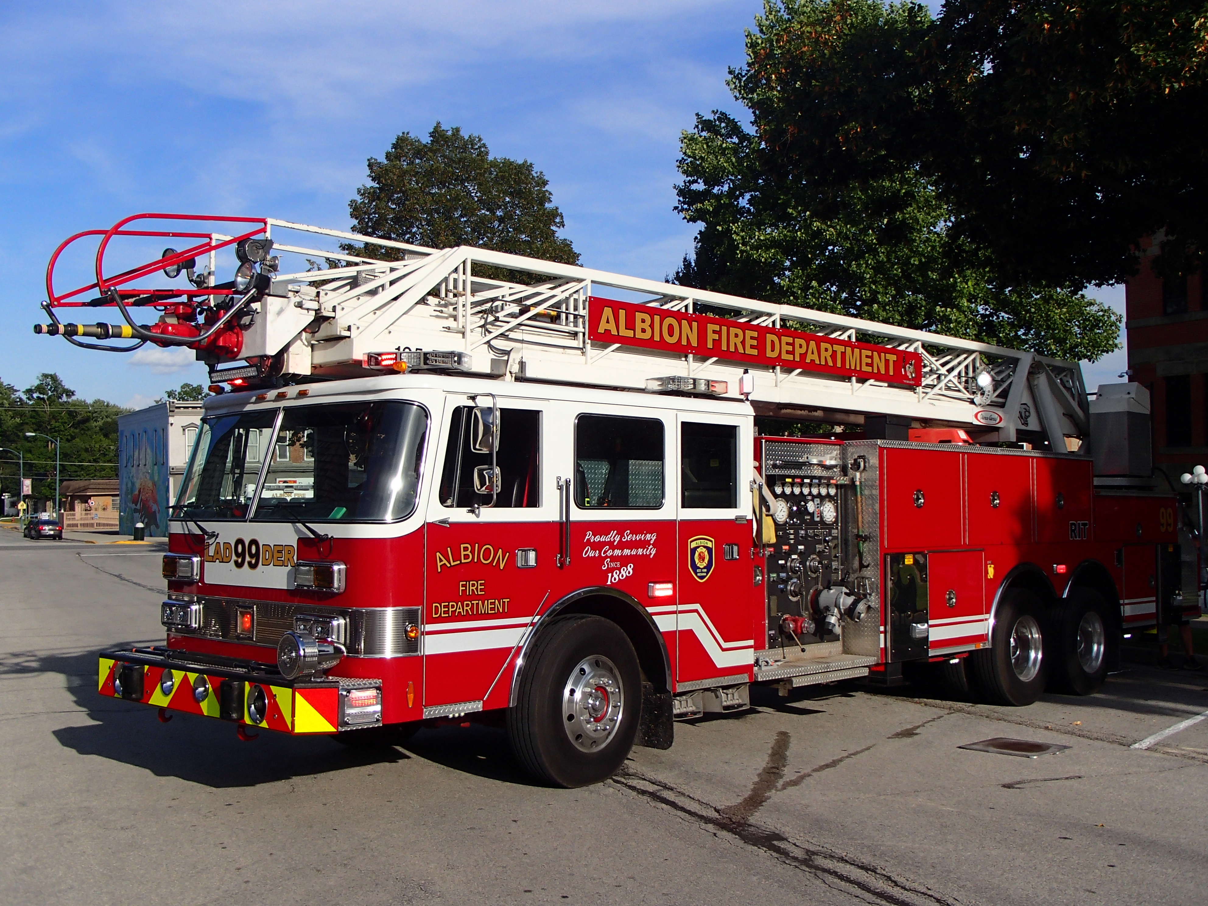 Why is it called Ladder 99 if we only have one? Each fire department in Noble County has a different number. Back in the day it was planned to be in alphabetical order, with Albion being Base 10, but we didn't adapt it for many years and so the Kendallville Fire Department took that number. As a result Albion eventually took the last number, so our first out engine is Engine 91, the water tankers are 94 and 95, and so on. It was the same with individual members, which is why I was Fire 914 for many years.