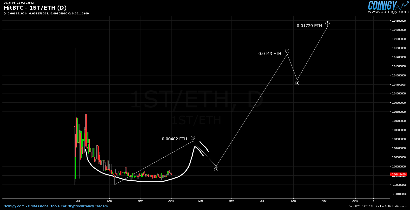 The 1st/ETH pair unsurprisingly displays almost identical pattern to 1st/BTC pair! This means that the sentiment segment of both pairs are quite similar. This doesn't mean that later they could diverge, and that certainly does happen. Why? Sentiment changes. The only constant about sentiment is that it changes...but then that itself is a Universal Constant! I've placed three targets for this pair as well and the maximum profit zone is 0.01729 ETH.