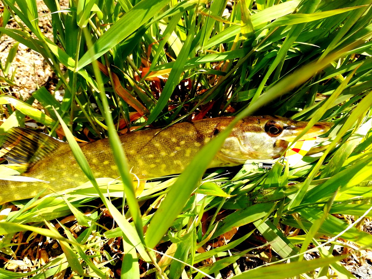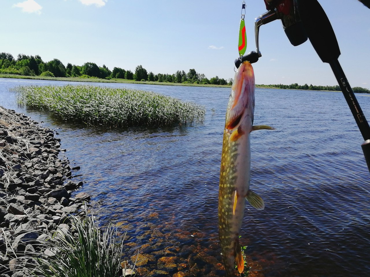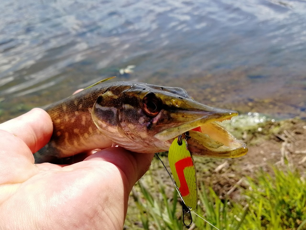 Пройдя до опор старого моста, делаю очередной заброс, надеясь на крупного окуня и чувствую резкий удар. Мой Stalker выгибается в дугу от самой вершинки до комеля. Фрикцион катушки начинает повизгивать, а адреналин добавляет дрожи рукам. Очень нежно, не форсируя события, начинаю выводить зубастую. Несмотря на далеко не трофейный размер, разбойница дарит настоящий кайф со свечками, мотанием головой и прочими прелестями сопутствующими не крупным щучкам.