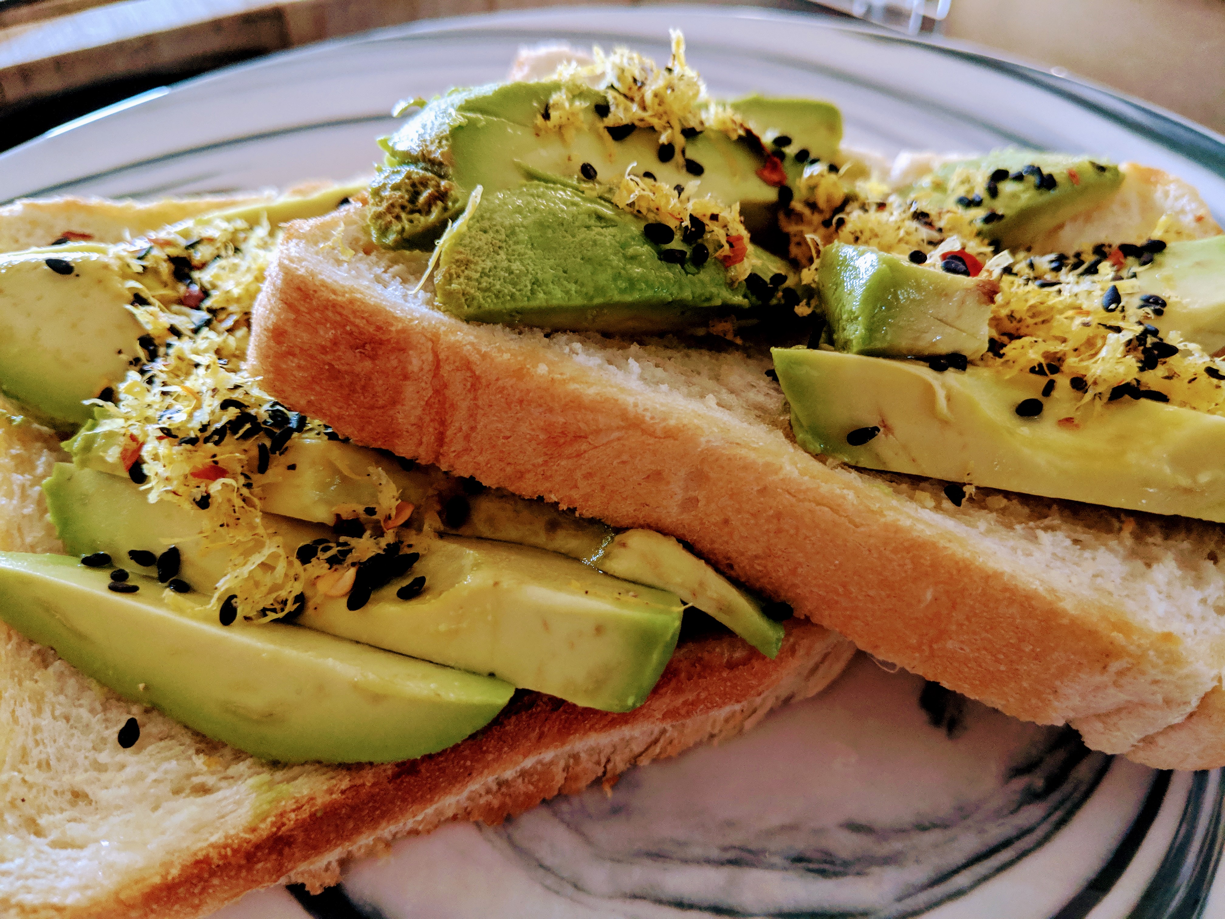 Avocado, Olive Oil, Lemon Zest, Black Sesame Seeds, Pepper/Salt and Chili Flakes!