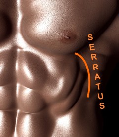 The Glanced: Obliques. They run diagonally on both sides of the six pack. They aid in twisting the body. Sometimes when you twist with a jerk and feel the "ouch" in the torso, it's the obliques you’ve just hurt.