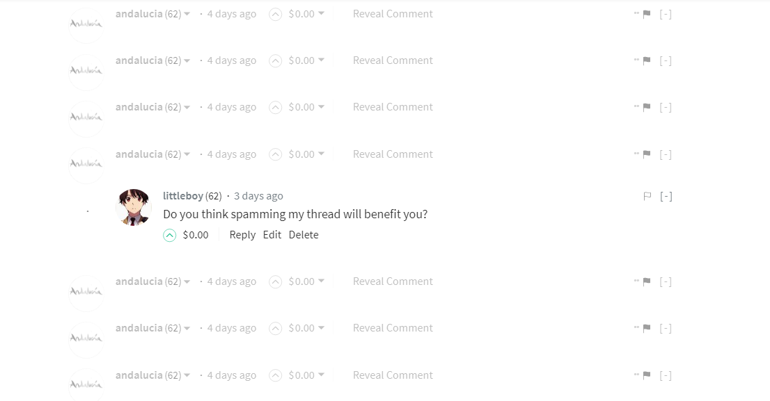 A not so ethical guy named @andalucia was spamming my thread with "1" comments. Yes, he wrote 1 in all of his comments: