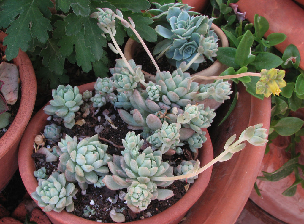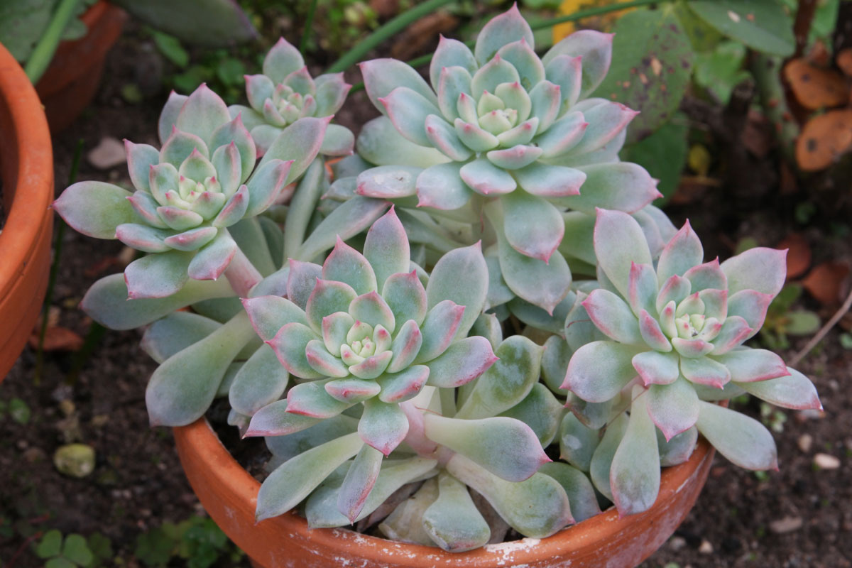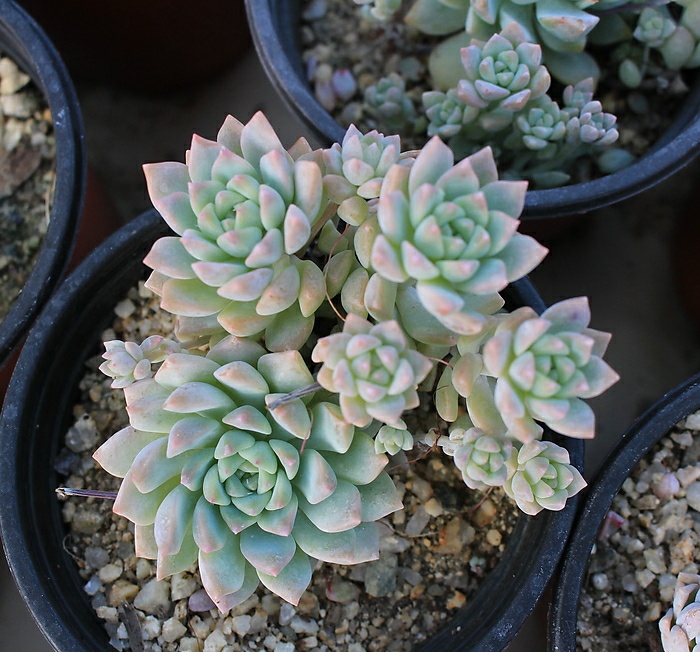 Some Echeveria also produce many seedlings and arise from the stalks under the leaves. This term is also called "hen and chicks". But often "hen and chicks happen to other types such as sempervivum.