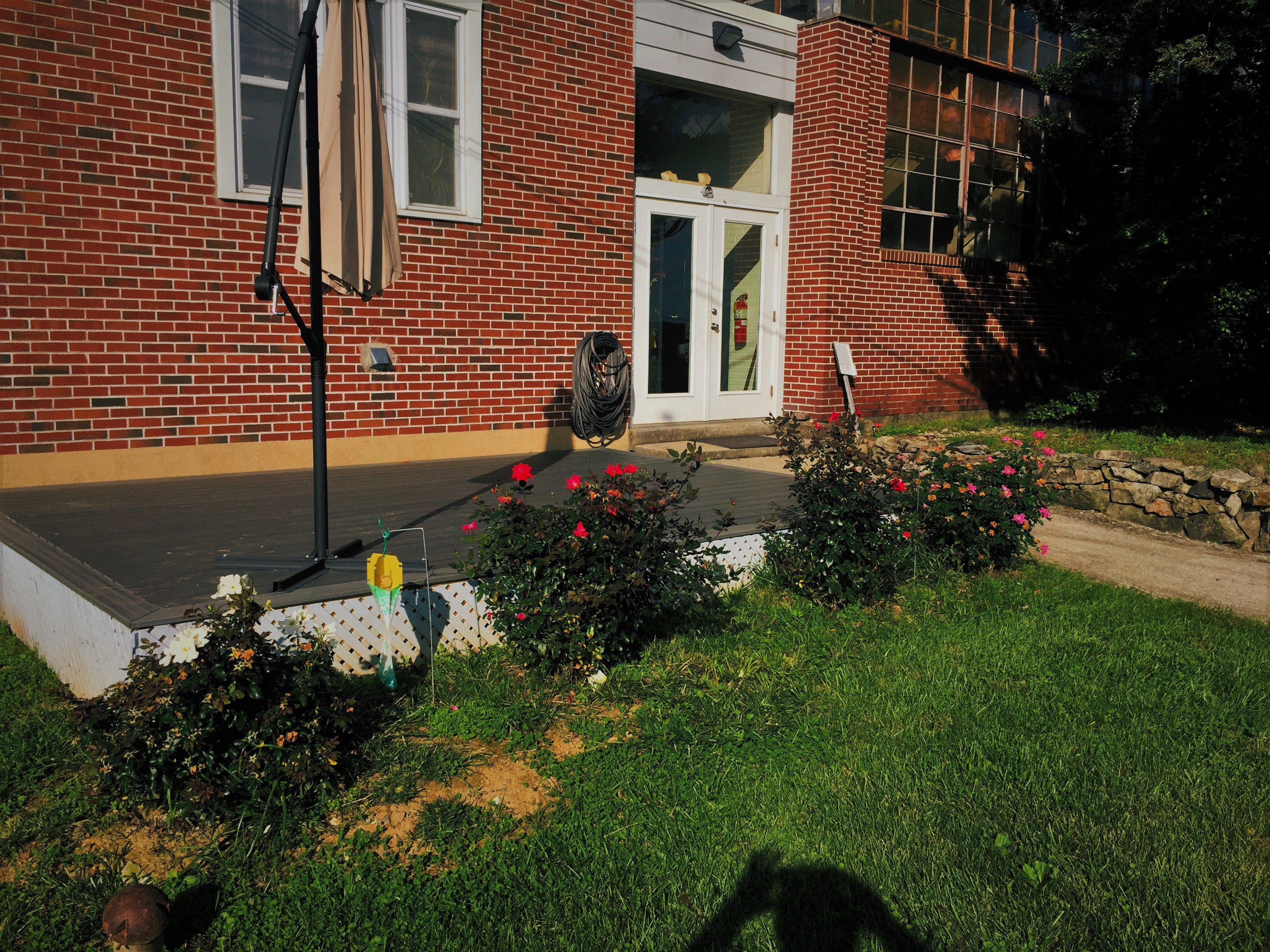 That deck is where we set up a picnic table in the summer to have lunch during work. These knockout roses bloom all summer long and right into the winter. I actually have a photo of them with snow on them.