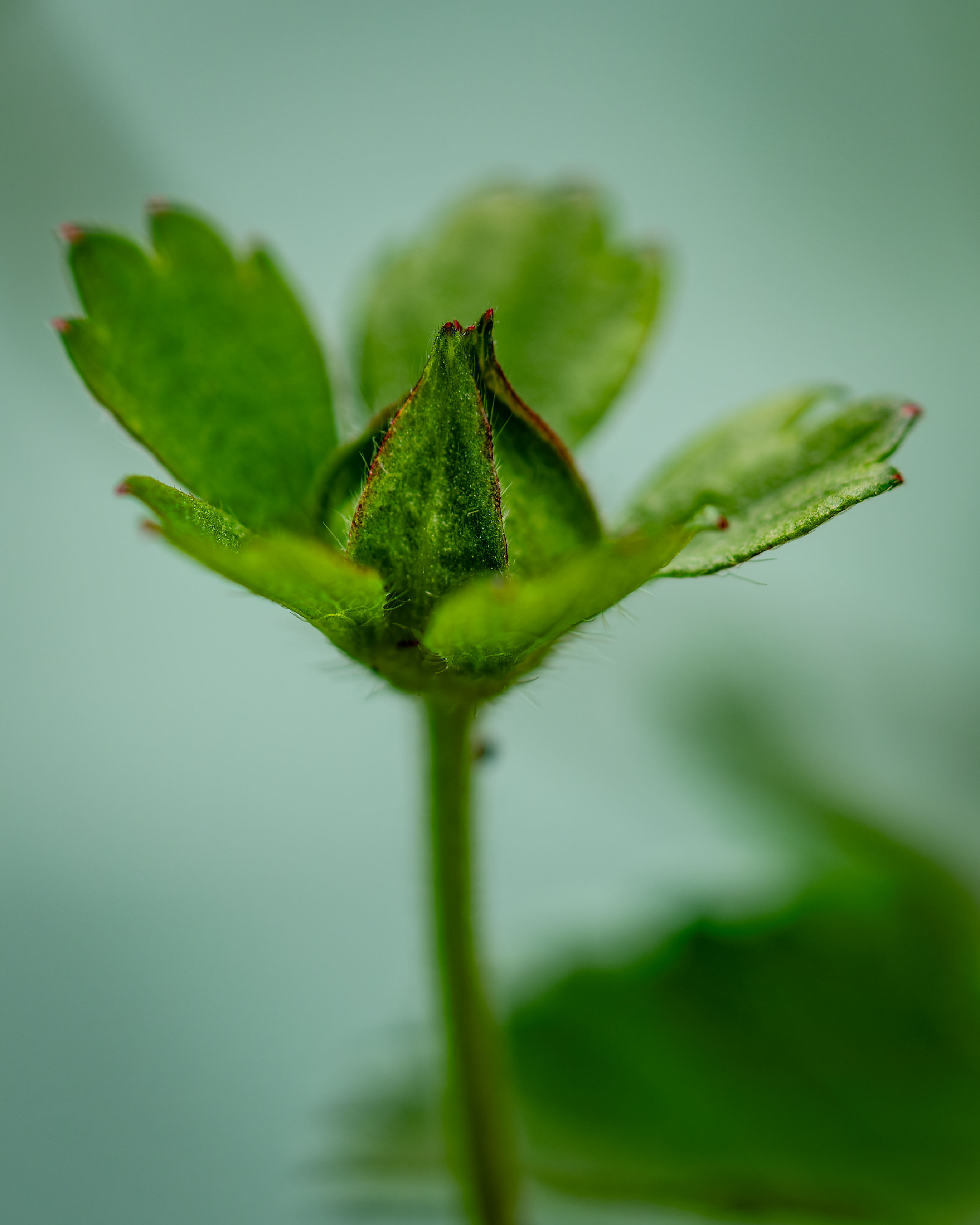 An immature and still green strawberry flower bud growing on my front balcony in a pot.