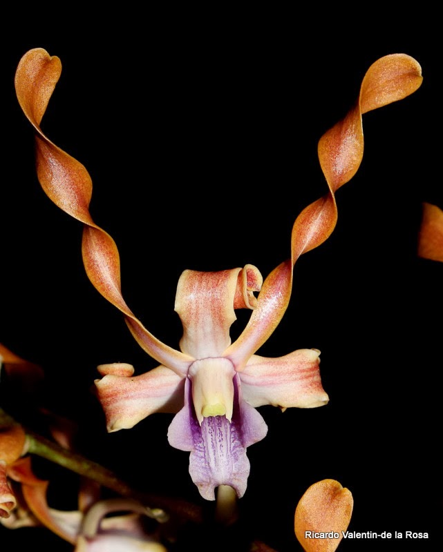 Dendrobium helix is one of the largest and most attractive flower species. The petals are twisted three or four times, their side lobes are narrowly elliptical, truncated and extending to the front.