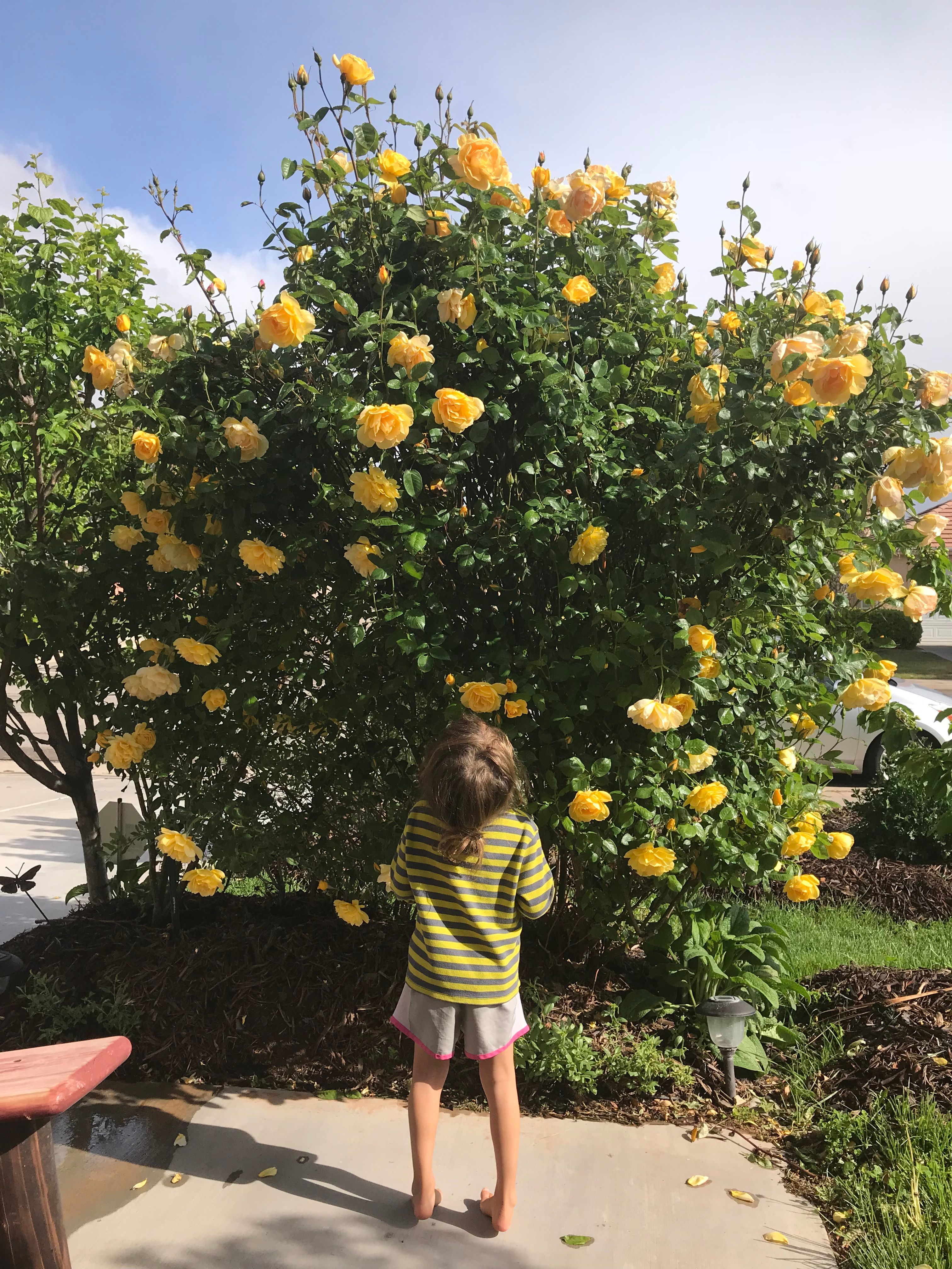 “Mmmmm daddy!” Roses! This is one giant bush greeting the sunrise with our son today.