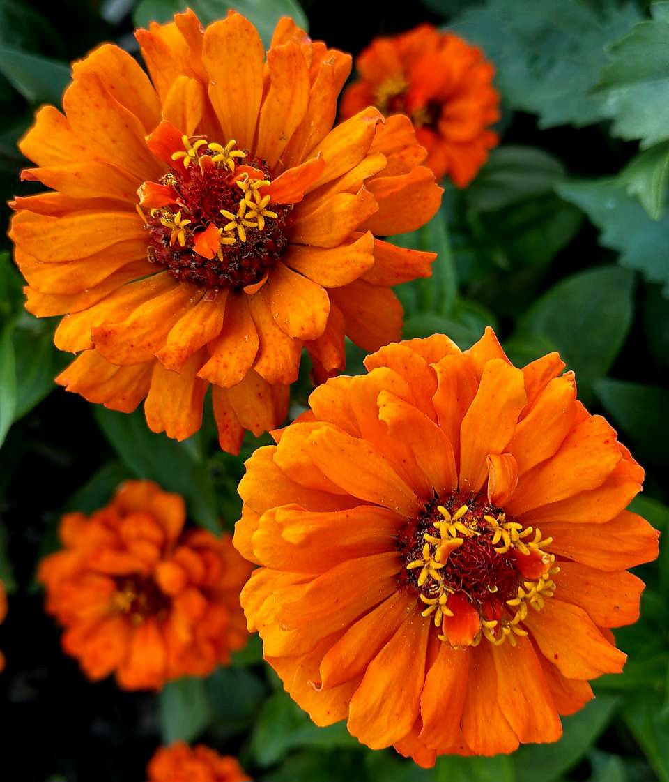 The orange zinnias burst forth like a vibrant sunset captured in bloom, their petals radiating warmth and joy. Each flower is a dazzling explosion of color, with layers of ruffled petals that seem to dance playfully in the breeze. The rich, fiery hues range from deep tangerine to soft apricot, creating a harmonious tapestry that draws the eye and uplifts the spirit.