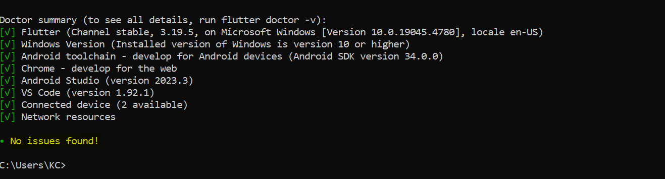 After adding flutter path now it is accessible. And now we can command it for its installation and to check its further requirements in the command prompt.