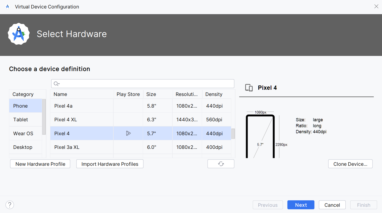 Here you can see the list of all the available virtual devices in the android studio. We can choose virtual device of any type.