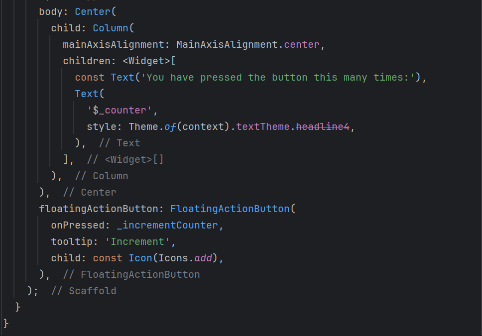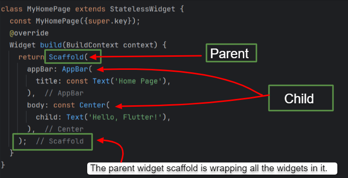 Centerwidget is again wrapping theTextwidget. Here the center widget is parent and the text widget is its child. It is the nested parent child relationship.