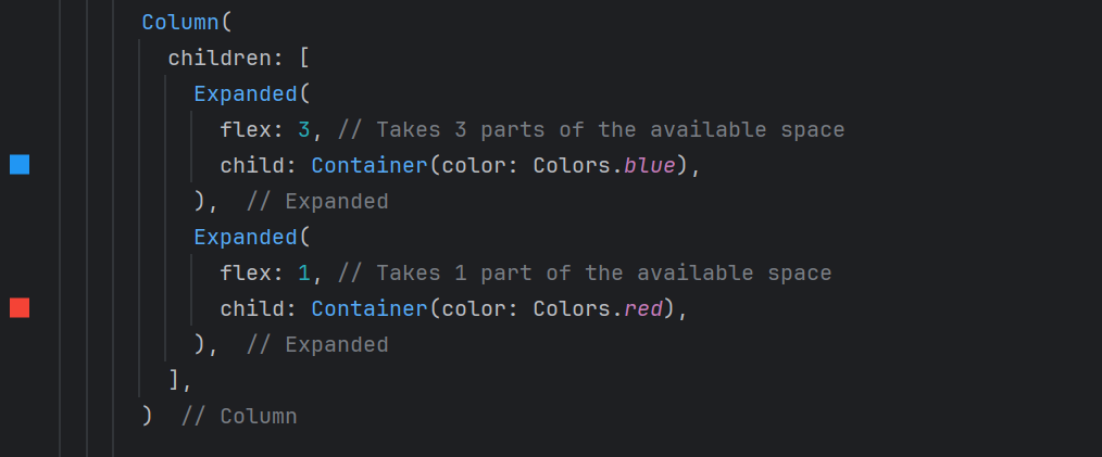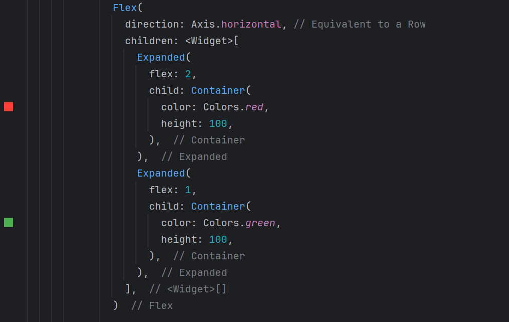 In the above example of flex I have used horizontal direction. And the flex property of the first container which is of red colour is used as 2 under the expanded widget. It will occupy the 2/3 parts of the screen as the complete screen is divided into 3 parts.