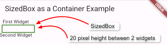 It is the output of the above code. Where i have highlight the space with the help of a box which is representing the sizedbox of 20 pixels between the two widgets. It is how the sizedbox is used to give space between the widgets.