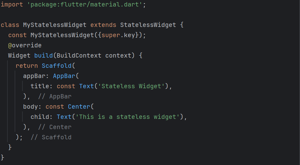This is an immutable widget. It means that its state cannot be changed in the real time once it is created in the application. It does not has any internal state. It is only called when the widget is added into the widget tree or when its parent widget is called and throughout its life cycle it remains unchanged if the whole app is not rebuilt. These widgets are useful when there is no need to track the state over time in the application. They are useful to represent the static data.