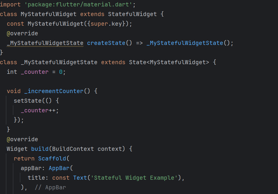 Moreover there is an important element of stateful widget which changes the state of the screen. That is setState(). It rebuilds the widget and update the screen user interface.